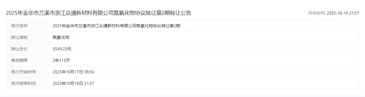 华市兰溪市浙江众通新材料有限公司氮氧化物协议转让第2期转让公告