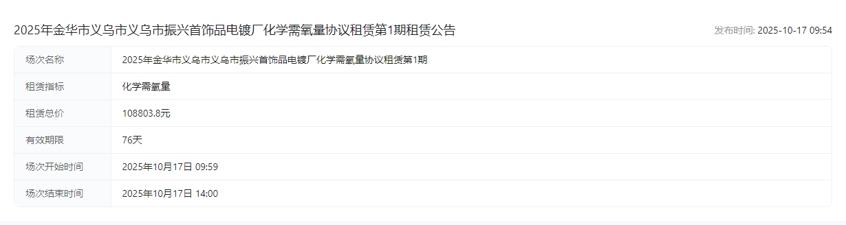 华市义乌市义乌市振兴首饰品电镀厂化学需氧量协议租赁第1期租赁公告交易公告