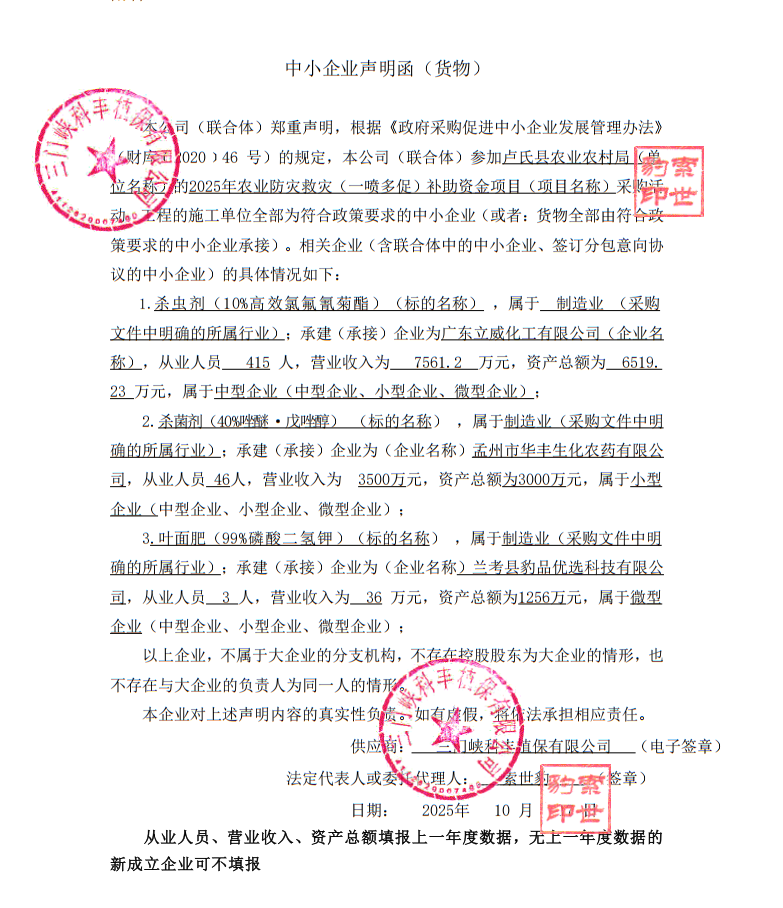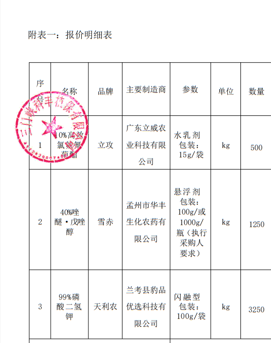 | 本公告公示期为*个工作日。供应商对成交结果有异议的,可以在本成交公告公示期(*个工作日)满后*个工作日内,以书面形式向采购代理机构提出质疑(法定代表人签字并加盖单位公章),由法定代表人或其授权代表携带企业营业执照(加盖公章)及本人身份证件一并提交,并以质疑函接受的确认日期作为受理时间,逾期未提交或未按照要求提交的质疑函将不予受理。 *、成交供应商信息: 成交供应商:三门峡科丰植保有限公司 统一社会信用代码:****************** 法定代表人:索世豹 项目负责人:索世豹 联系方式:*********** *、监督单位:卢氏县政府采购办公室 联系人:郭伟静 电话:************ 地址:卢氏县城关镇解放路中段 监督单位:卢氏县委农村工作领导小组办公室 联系人:董雷鹏 电话:***********、************ 地址:卢氏县西街二街坊**号 | |||||||||||||||||||||||||||||||
