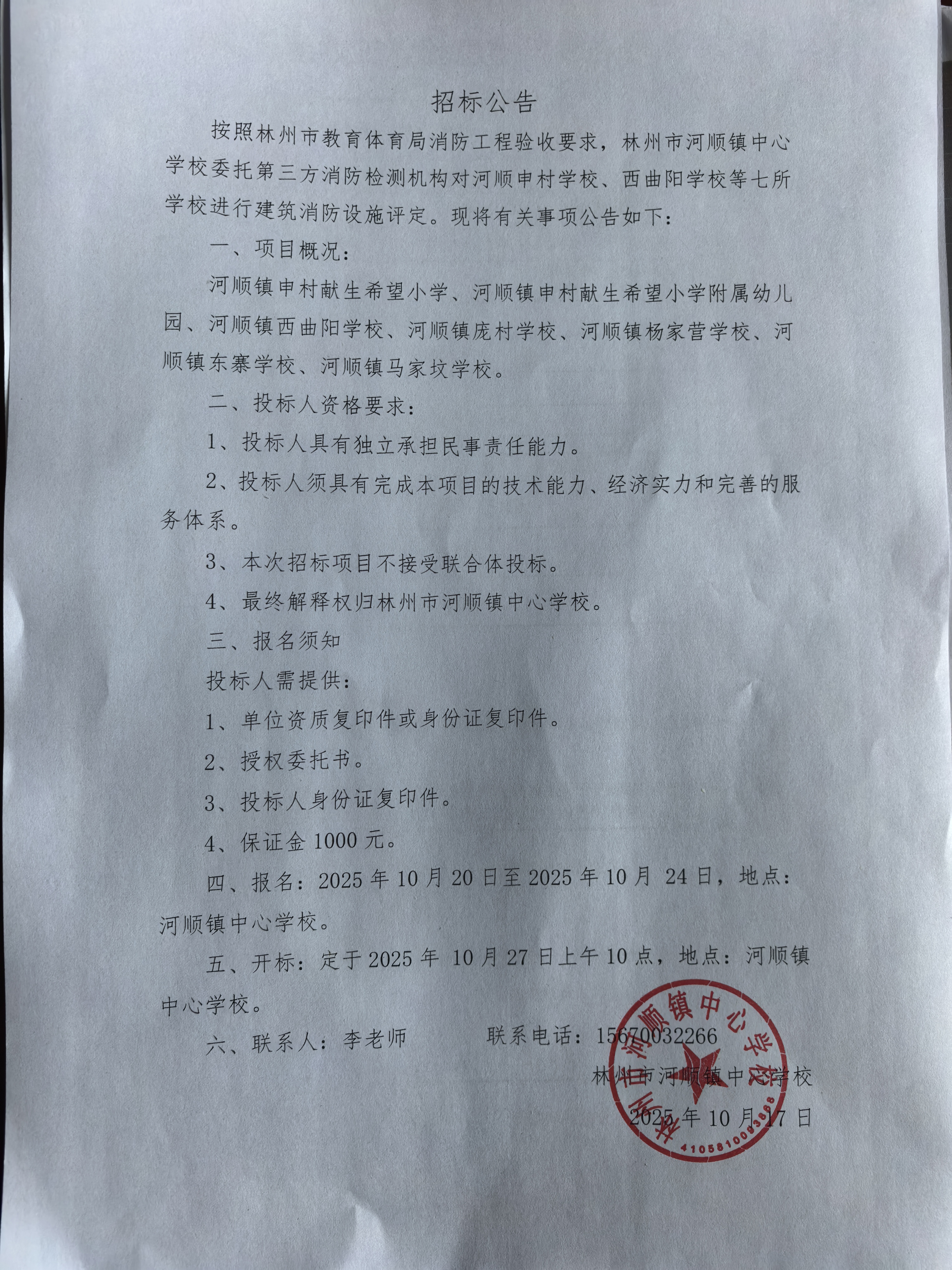 林州市河顺镇中心学校消防检测机构评定招标2025年6至10月政府采购意向