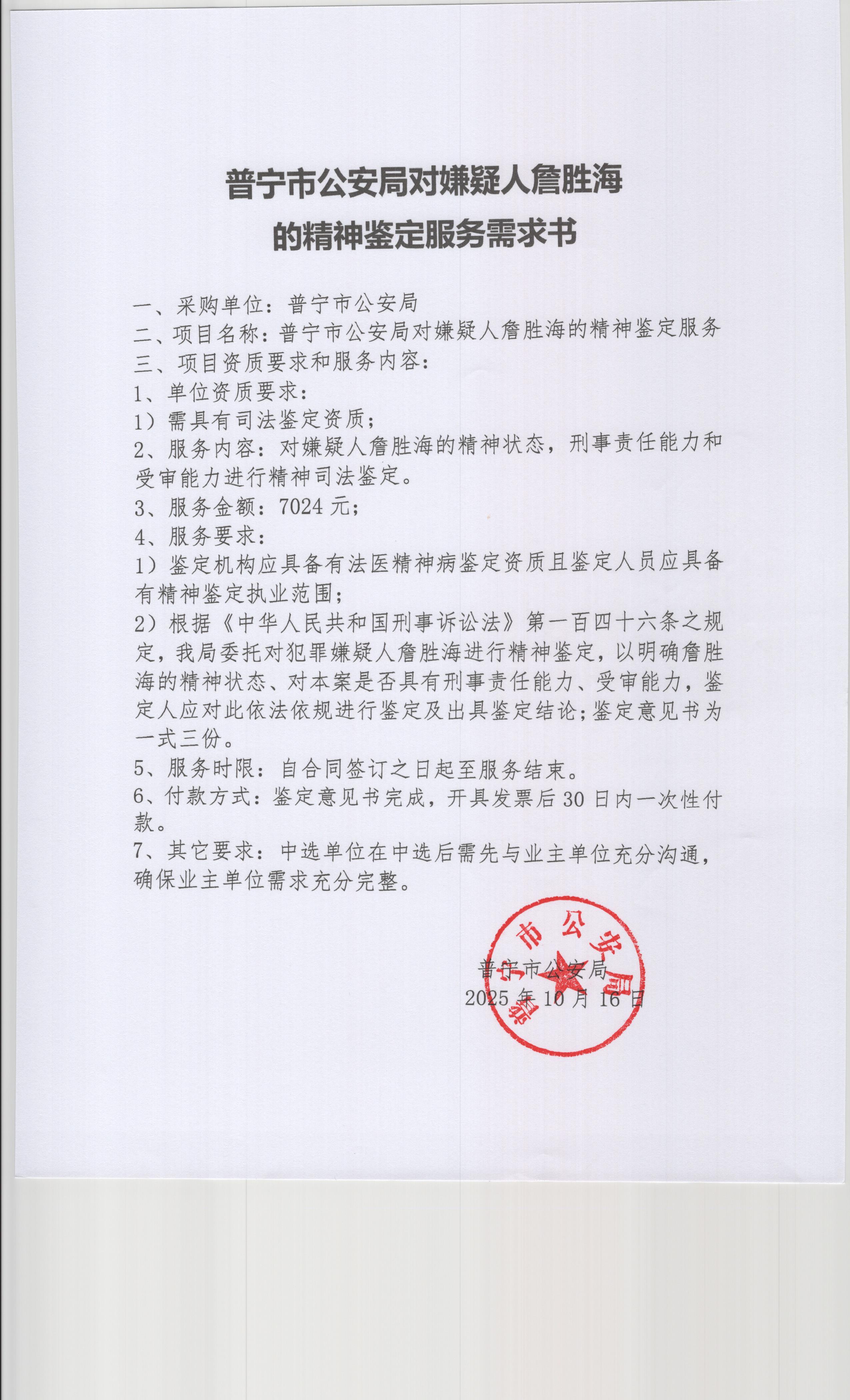 普宁市公安局对嫌疑人詹胜海的精神鉴定服务采购公告