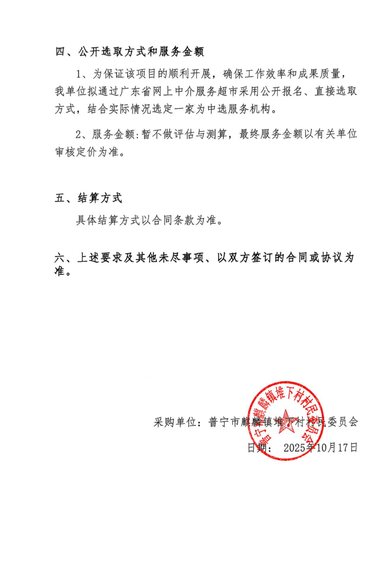 ********** **:** ,在广东省网上中介服务超市为普宁市麒麟镇堆下村村民委员会 公开选取安全评价中介服务机构,现将相关事项公告如下: