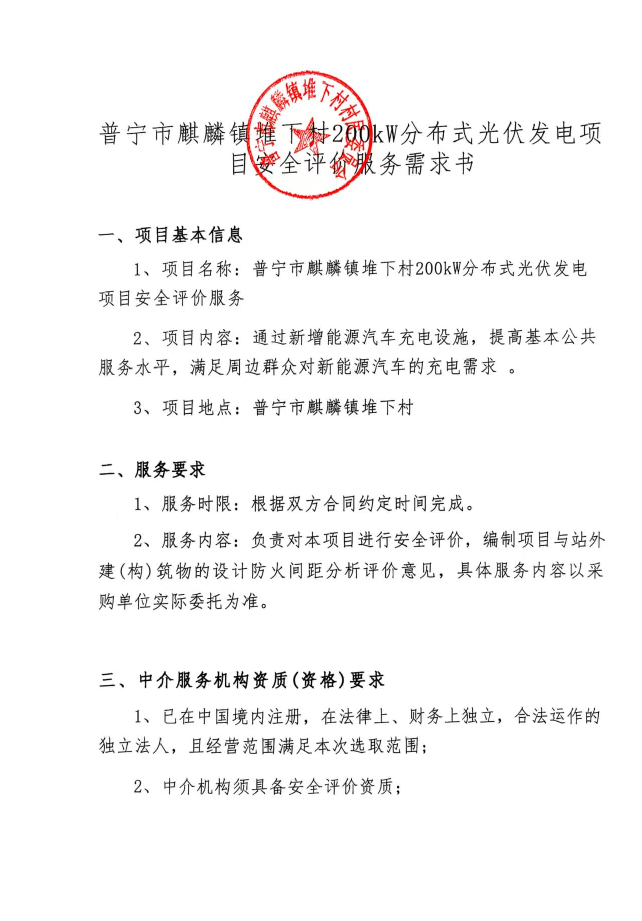 关于为【普宁市麒麟镇堆下村*****分布式光伏发电项目安全评价服务】公开选取【安全评价】机构的公告