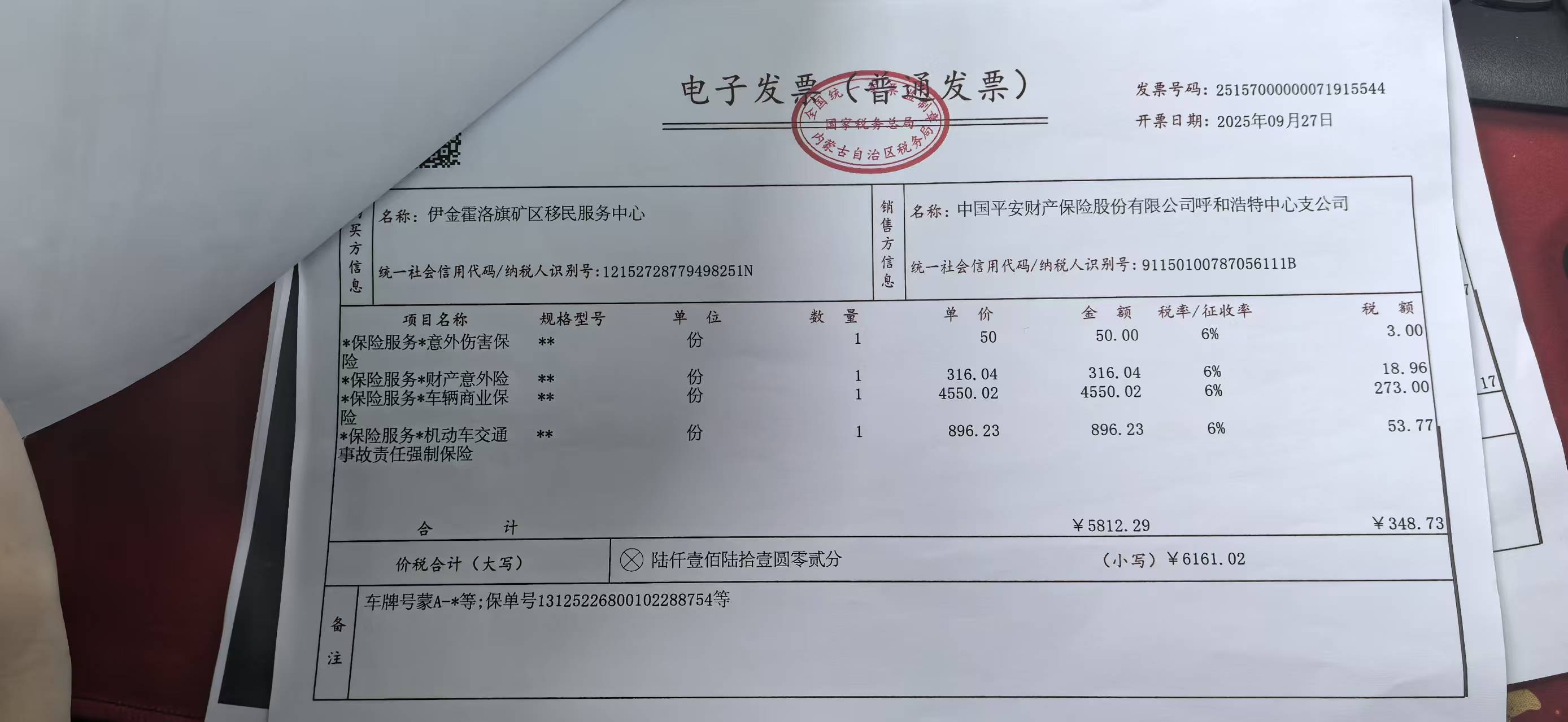 一、合同编号:******车辆保险********二、合同名称:伊金霍洛旗矿区移民服务中心车辆保险采购项目三、项目编号:鄂财购备字(电子)[****]*******号四、项目名称:伊金霍洛旗矿区移民服务中心公务用车保险采购项目五、合同主体采购人(甲方):伊金霍洛旗矿区移民服务中心 地址:鄂尔多斯市伊金霍洛旗 联系方式:*********** 供应商(乙方):中国平安财产保险股份有限公司呼和浩特中心支公司 地址:内蒙古自治区呼和浩特市玉泉区大学西街与石羊桥路交汇处 联系方式:*********** 六、合同主要信息主要标的: