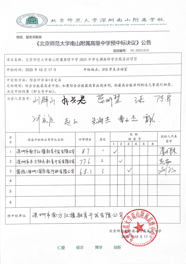 北京师范大学南山附属高级中学2025年学生湖南研学实践活动项目预中标决议公告