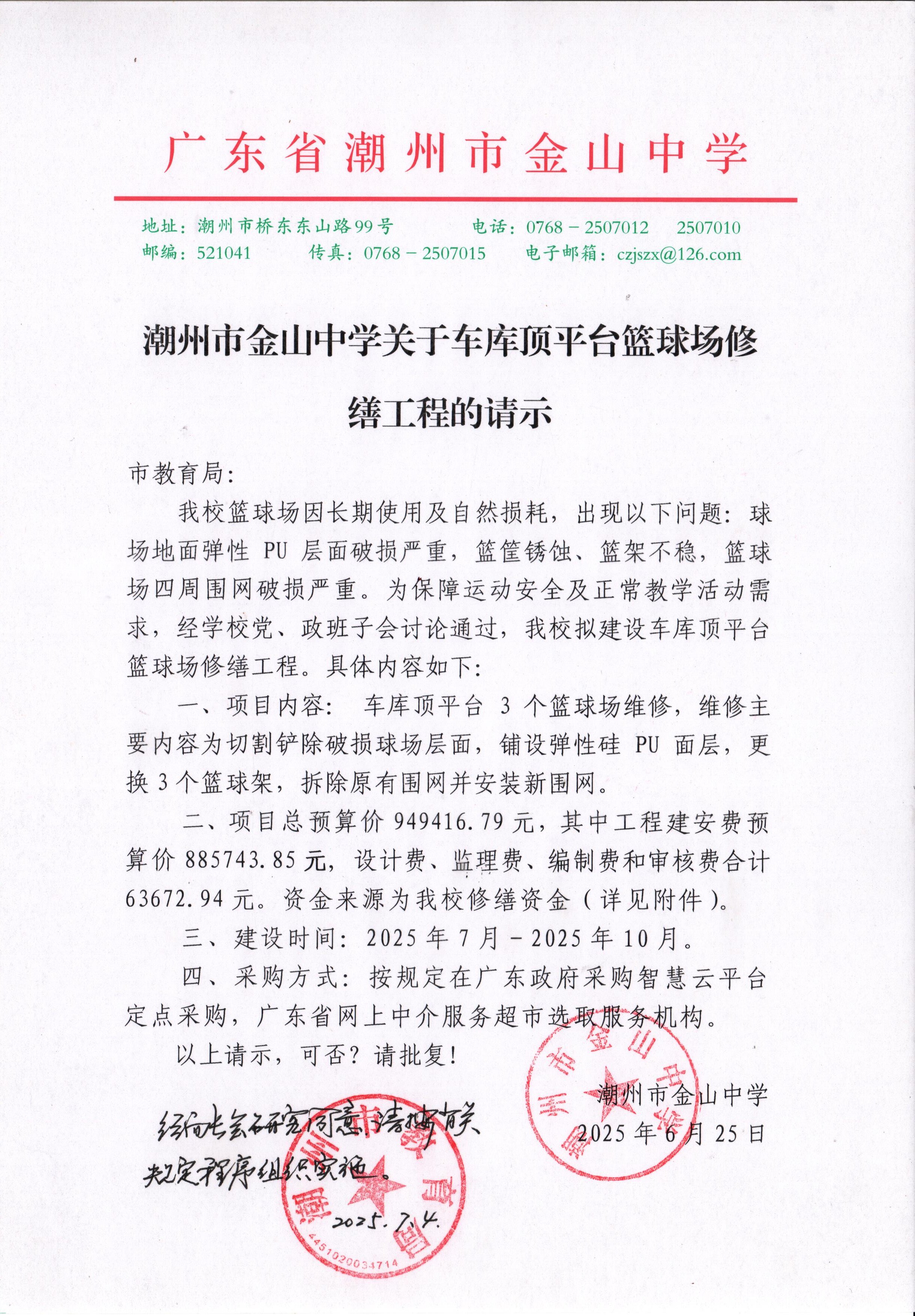 潮州市金山中学车库顶平台篮球场修缮工程-预算编制费、工程设计费、监理费审核、预算审核费和结算审核费审核采购公告