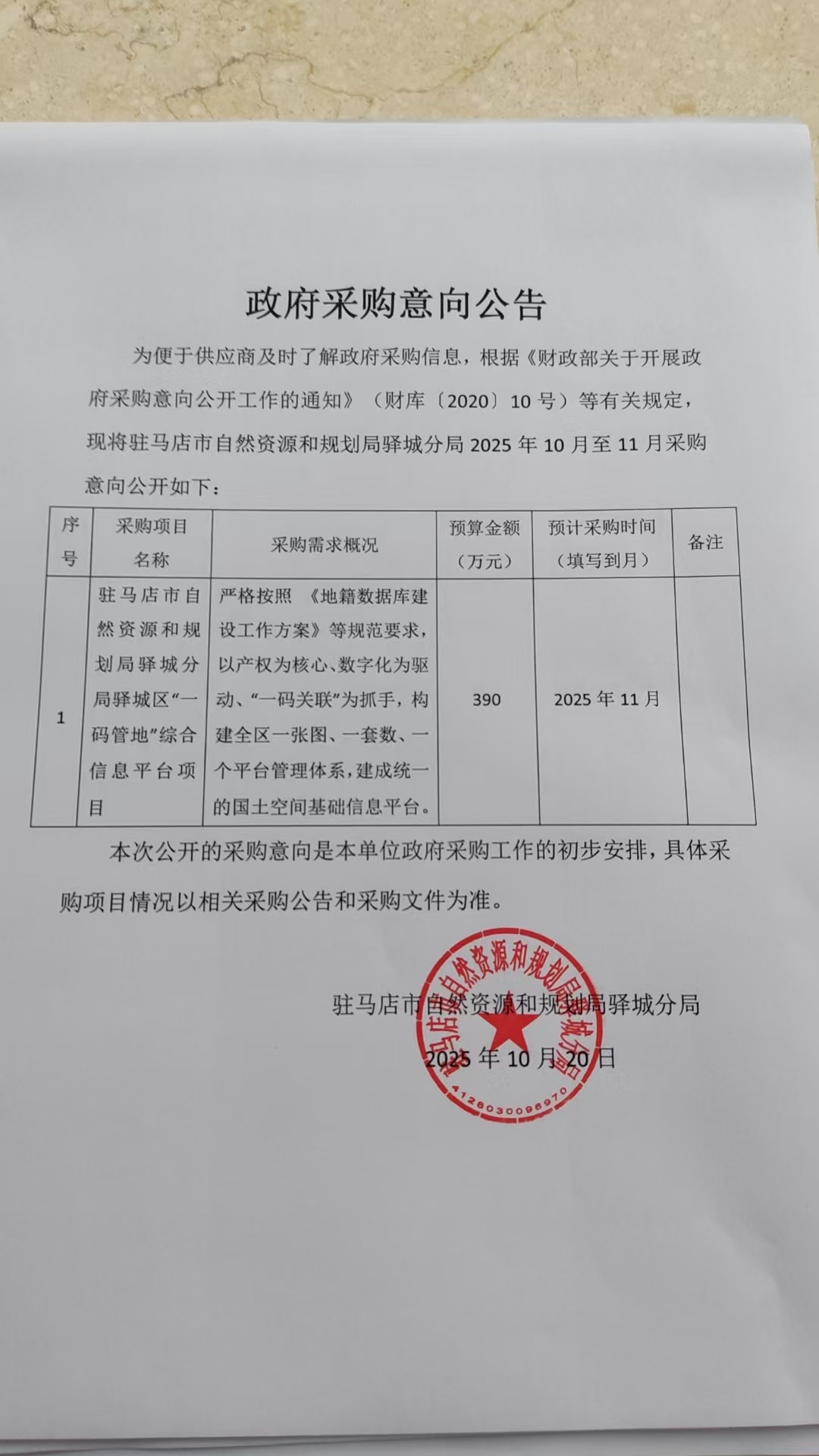 驻马店市自然资源和规划局驿城分局2025年10至11月政府采购意向