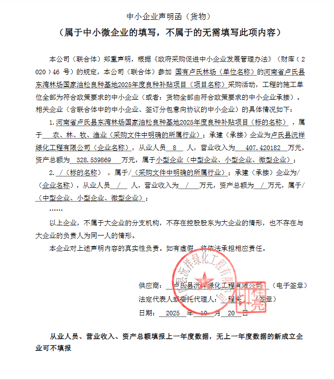 国有卢氏林场河南省卢氏县东湾林场国家油松良种基地2025年度良种补贴项目-成交公告