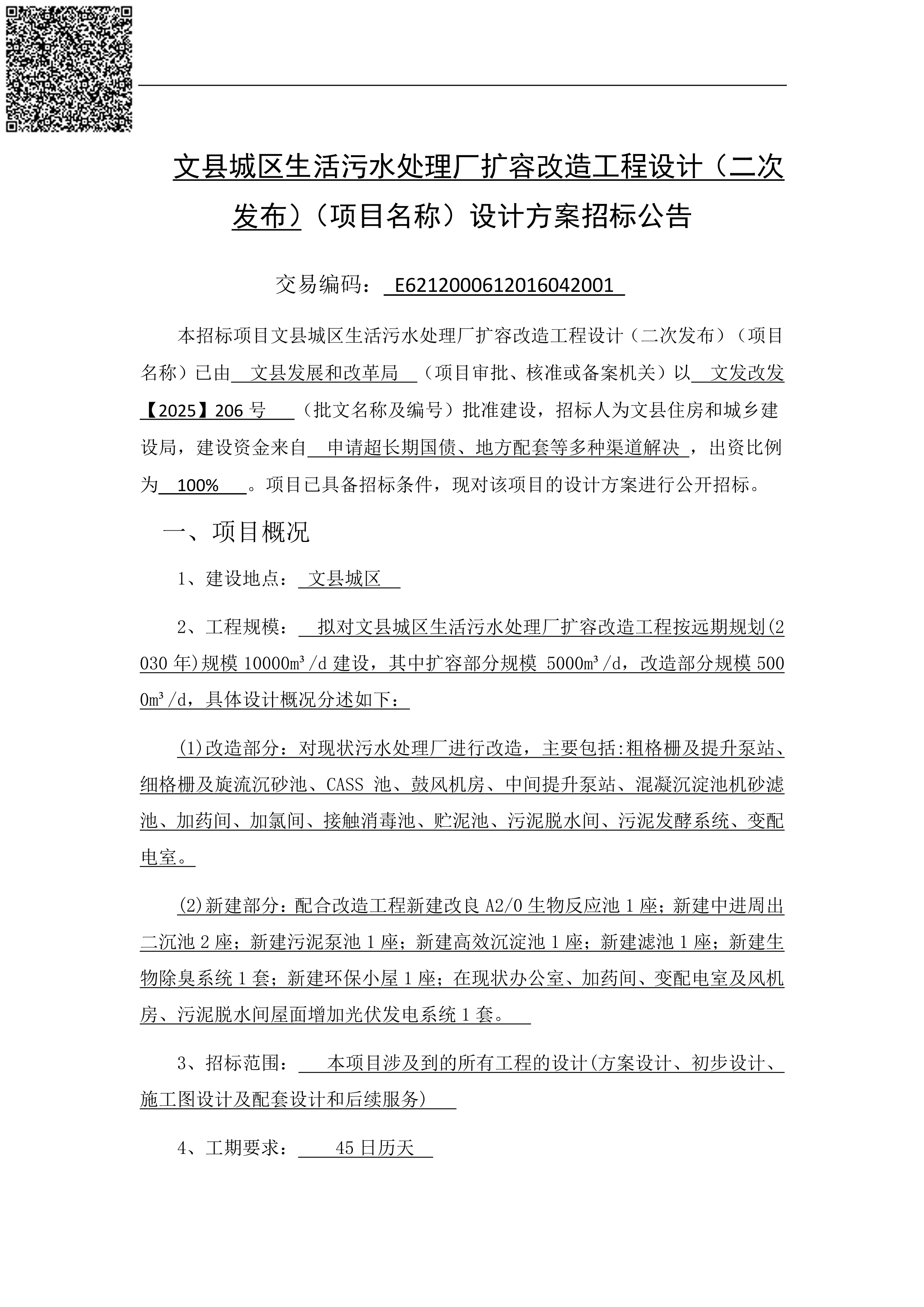 文县城区生活污水处理厂扩容改造工程设计(二次发布)招标公告