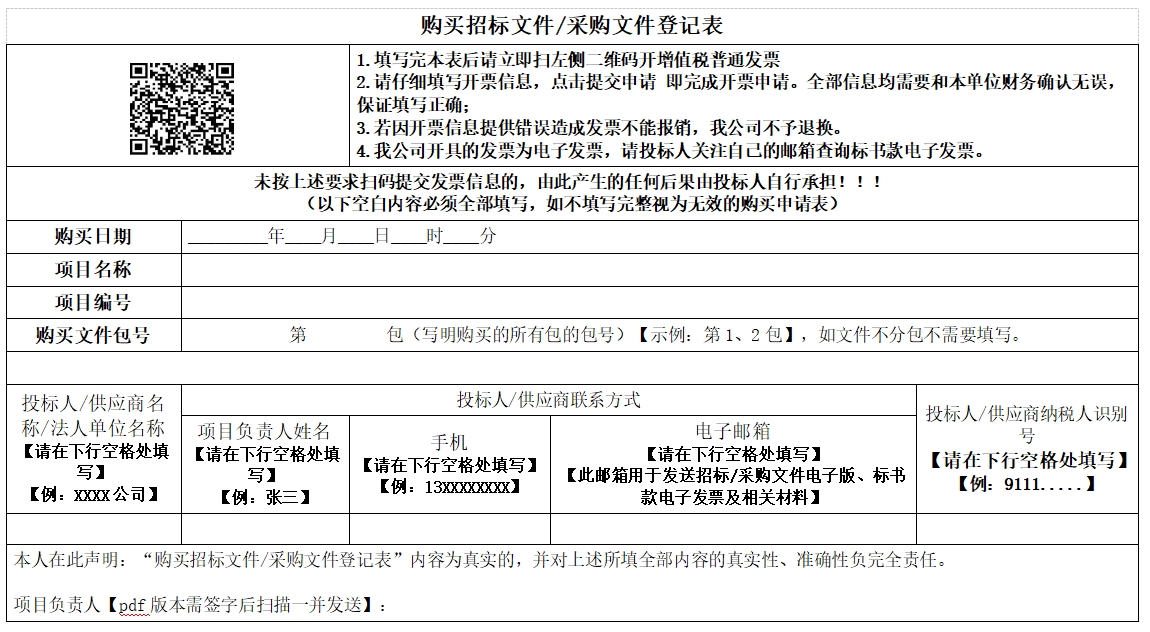 方式:请电汇购买议标文件。议标文件售价为***元人民币,售后不退。有兴趣的供应商可在****年**月**日至****年**月**日期间每个工作日下午**:**(北京时间)前汇款(不接受个人汇款)至采购代理机构指定账户,汇款时请必须注明“*******标书款”。汇款后请将汇款凭证和填写完毕的《购买招标文件/采购文件登记表》(*份可编辑的****版本及*份不可编辑的***版本),同时以电子邮件形式发送至********@***.**.**。采购代理机构工作日当日**:**时前收到邮件的于当日发送议标文件电子版,**:**时后收到的将视为是下一个工作日收到的邮件。