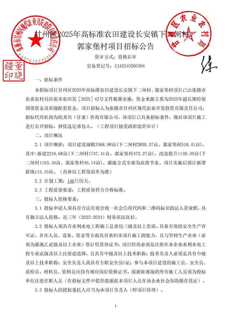 甘州区2025年高标准农田建设长安镇下二闸村、郭家堡村项目