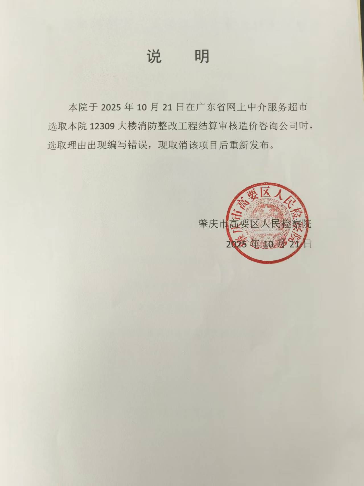 肇庆市高要区人民检察院12309大楼消防整改工程项目造价咨询(结算审核)采购失败项目公示