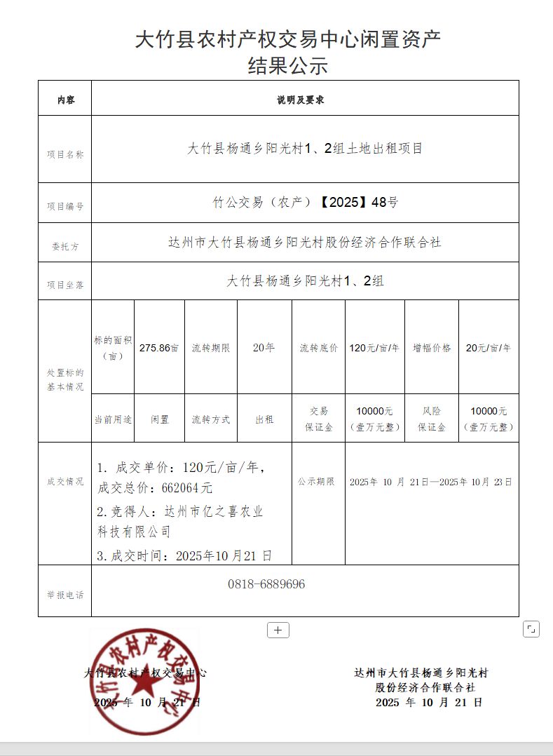 大竹县杨通乡阳光村1、2组土地流转项目结果公示