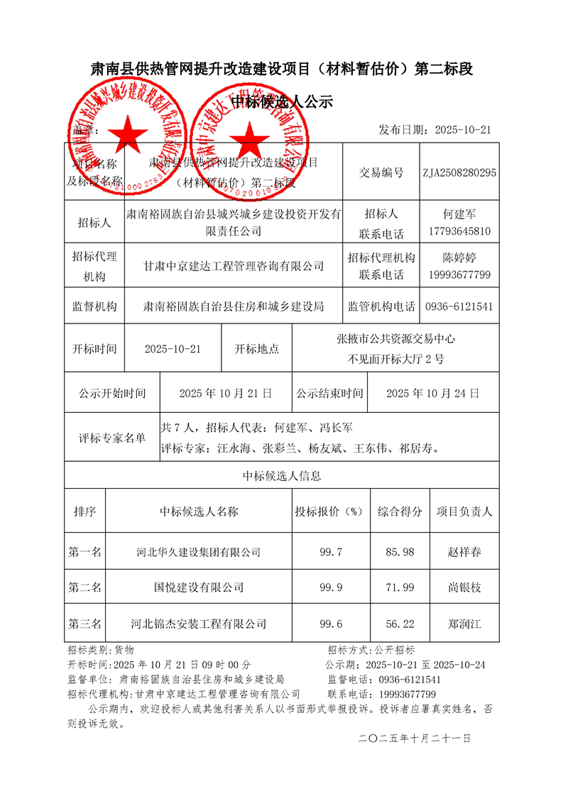 [市本级]肃南县供热管网提升改造建设项目(材料暂估价)第二标段中标候选人公示