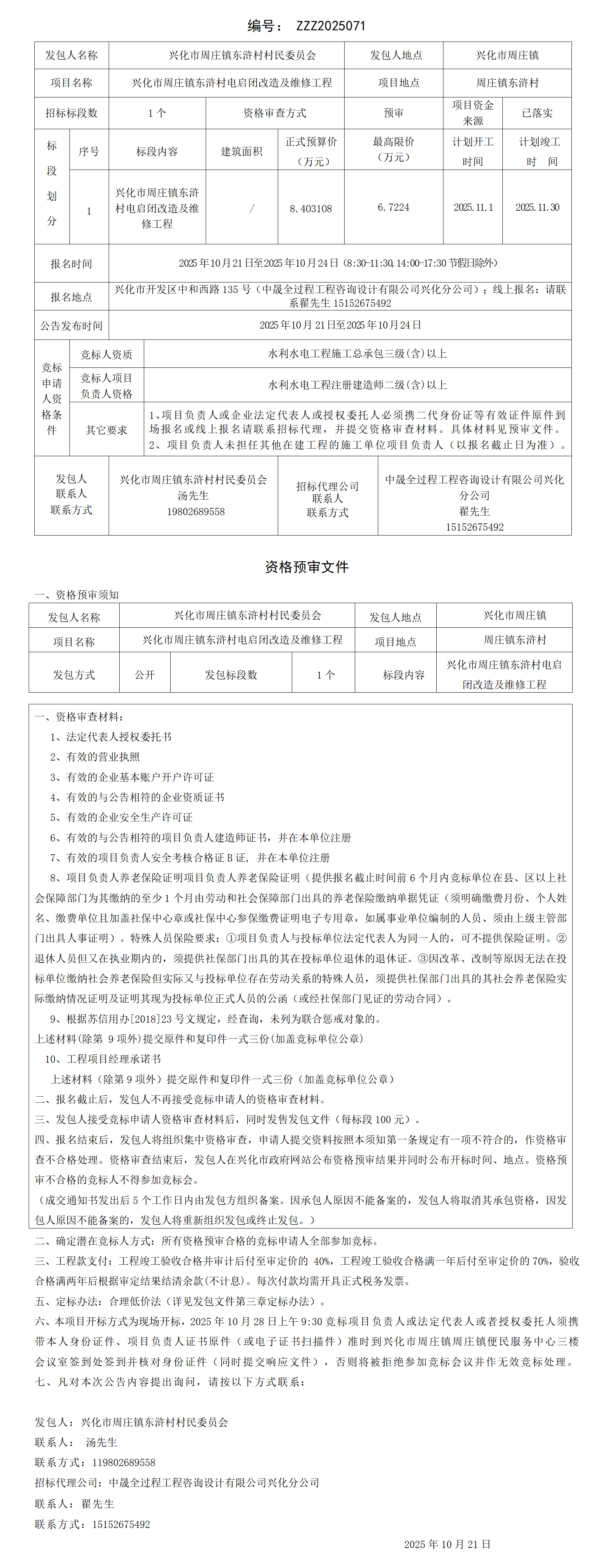 兴化市周庄镇东浒村电启闭改造及维修工程发包公告