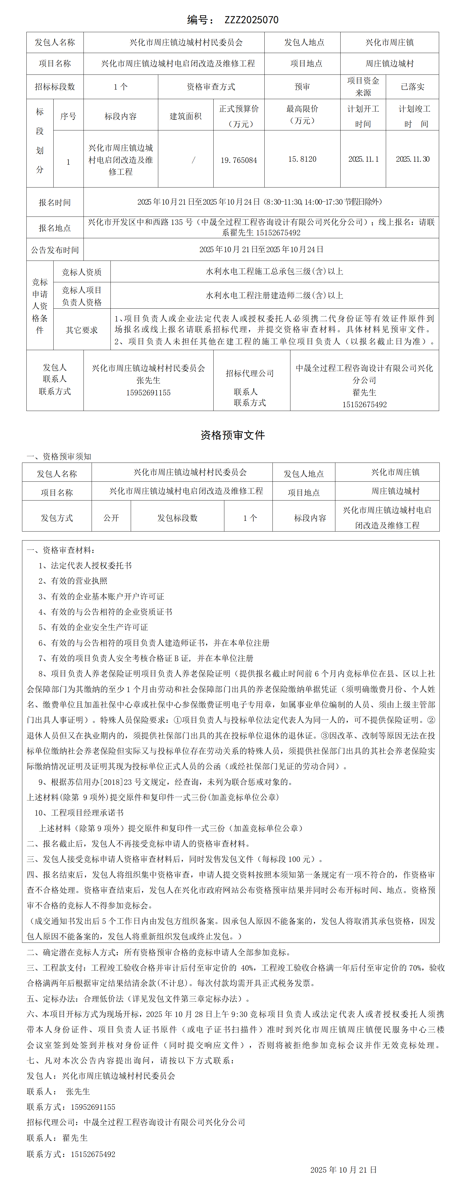 兴化市周庄镇边城村电启闭改造及维修工程发包公告