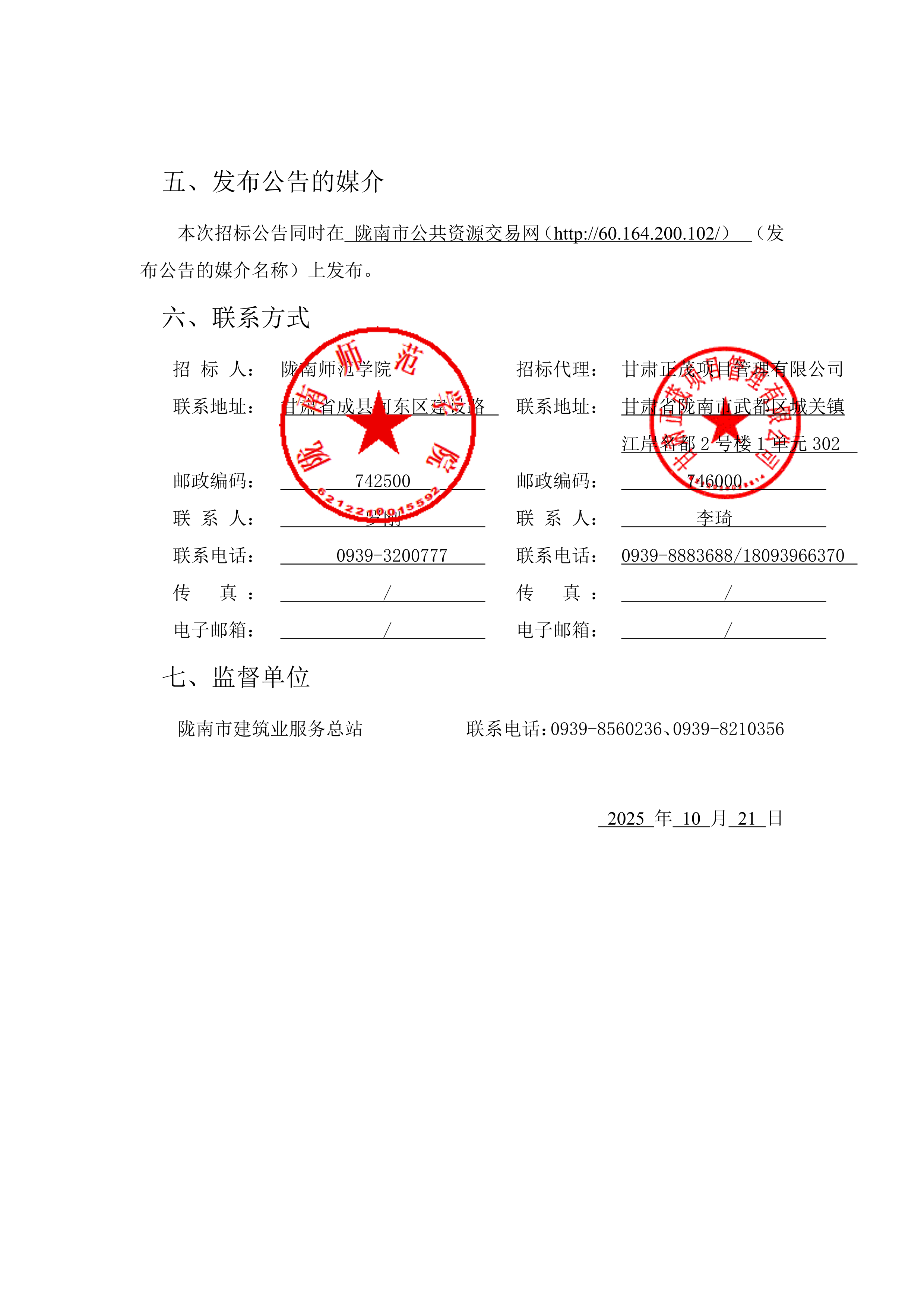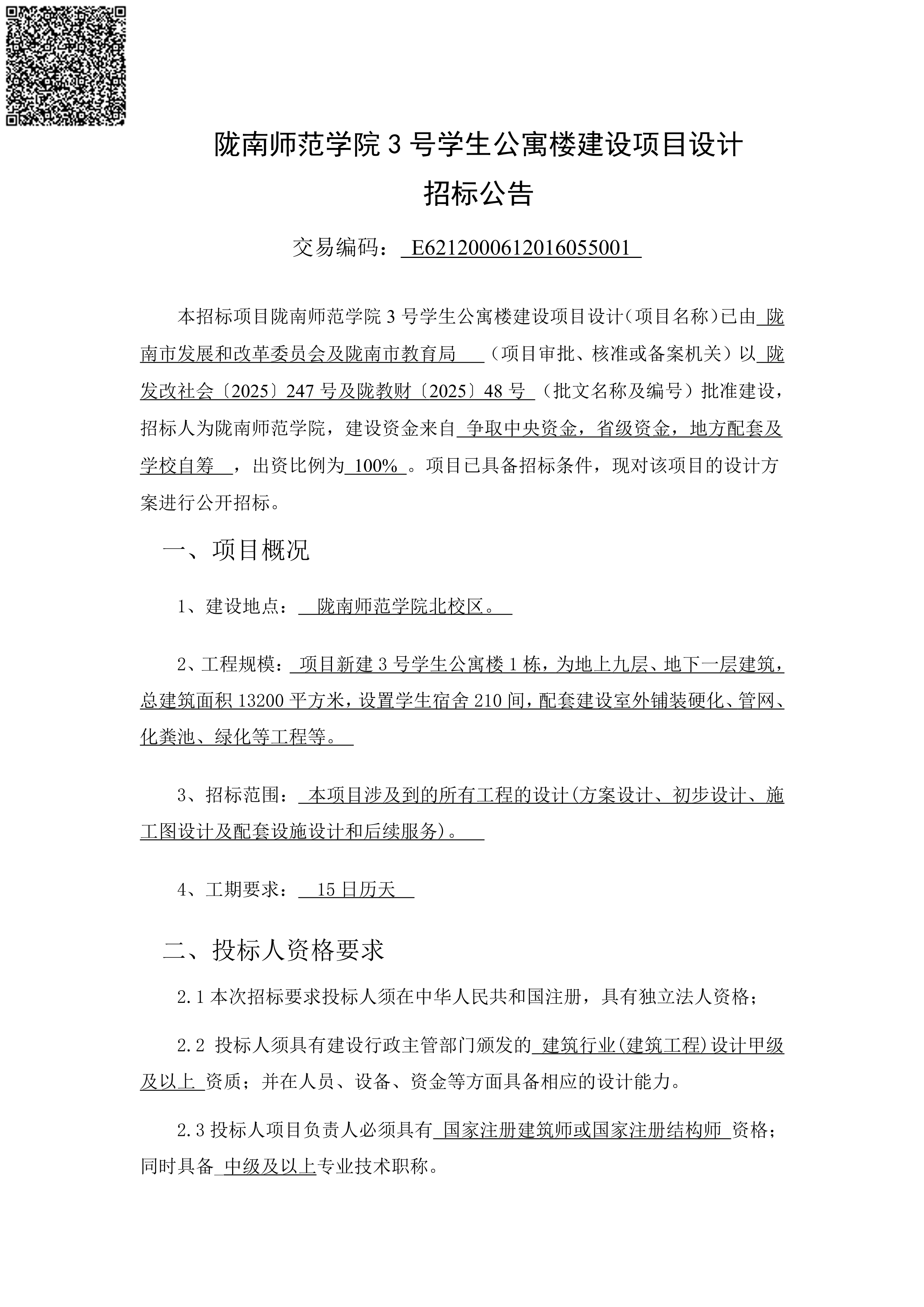 陇南师范学院3号学生公寓楼建设项目设计招标公告