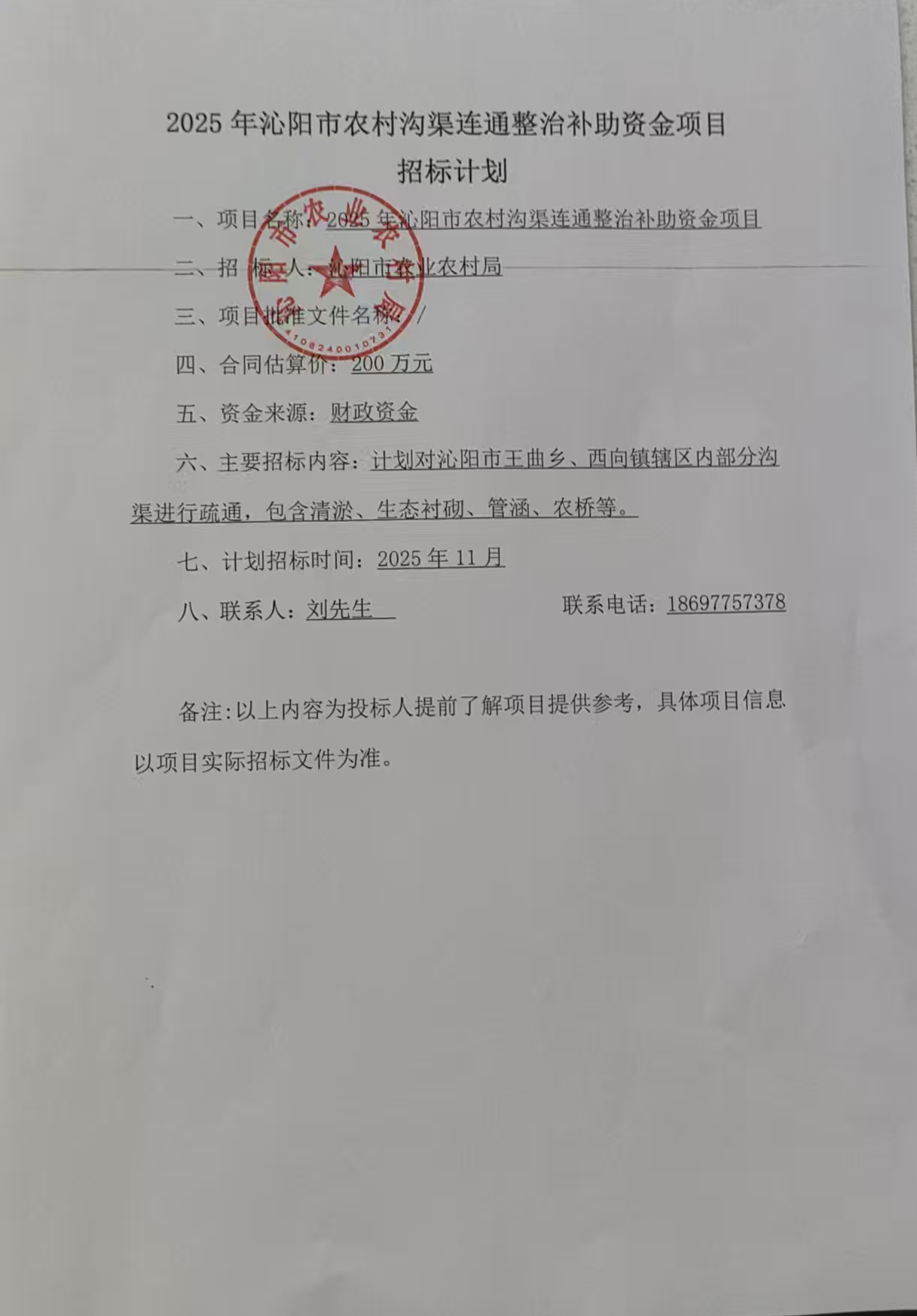 2025年沁阳市农村沟渠连通整治补助资金项目招标计划