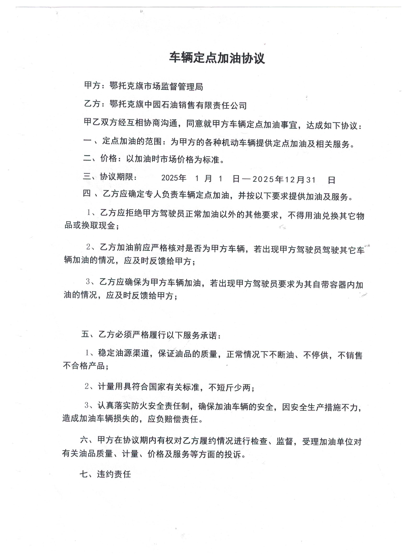 一、合同编号:鄂财购备字(电子)[****]*******号二、合同名称:车辆定点加油协议三、项目编号:鄂财购备字(电子)[****]*******号四、项目名称:车辆加油五、合同主体采购人(甲方):鄂托克旗市场监督管理局 地址:鄂尔多斯市鄂托克旗 联系方式:*********** 供应商(乙方):鄂托克旗中园石油销售有限责任公司 地址:内蒙古自治区鄂尔多斯市鄂托克旗内蒙古自治区鄂尔多斯市鄂托克旗乌兰镇阿尔寨街东石油公司北***米 联系方式:*********** 六、合同主要信息主要标的: