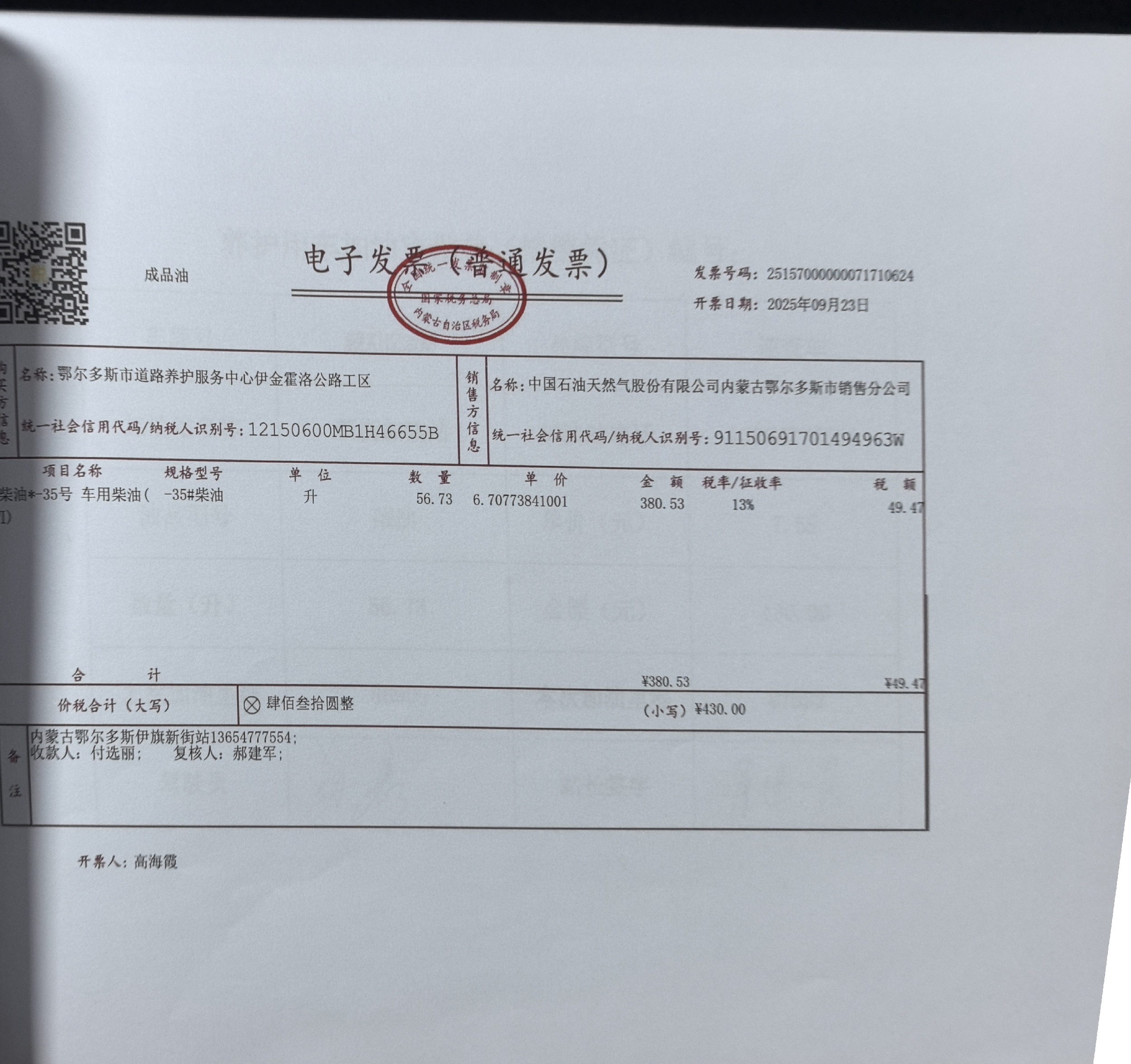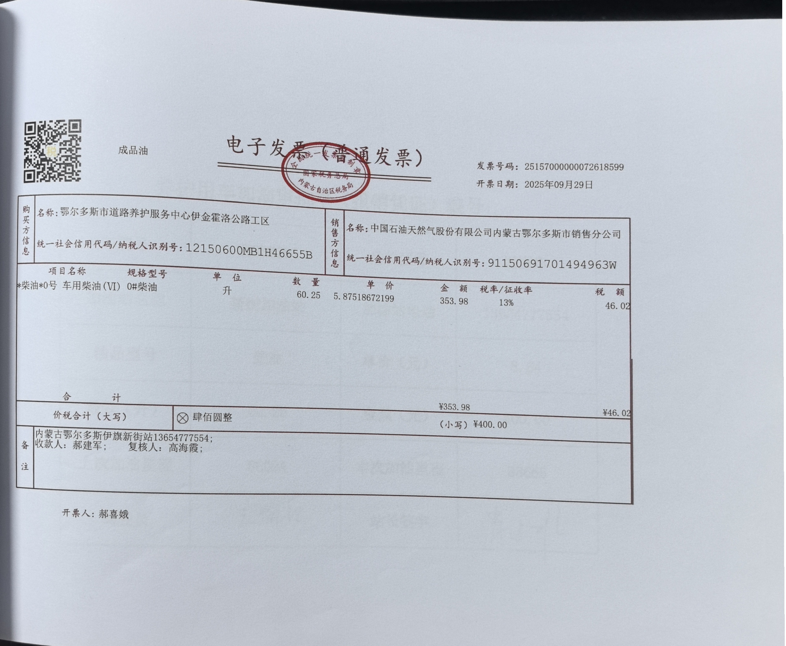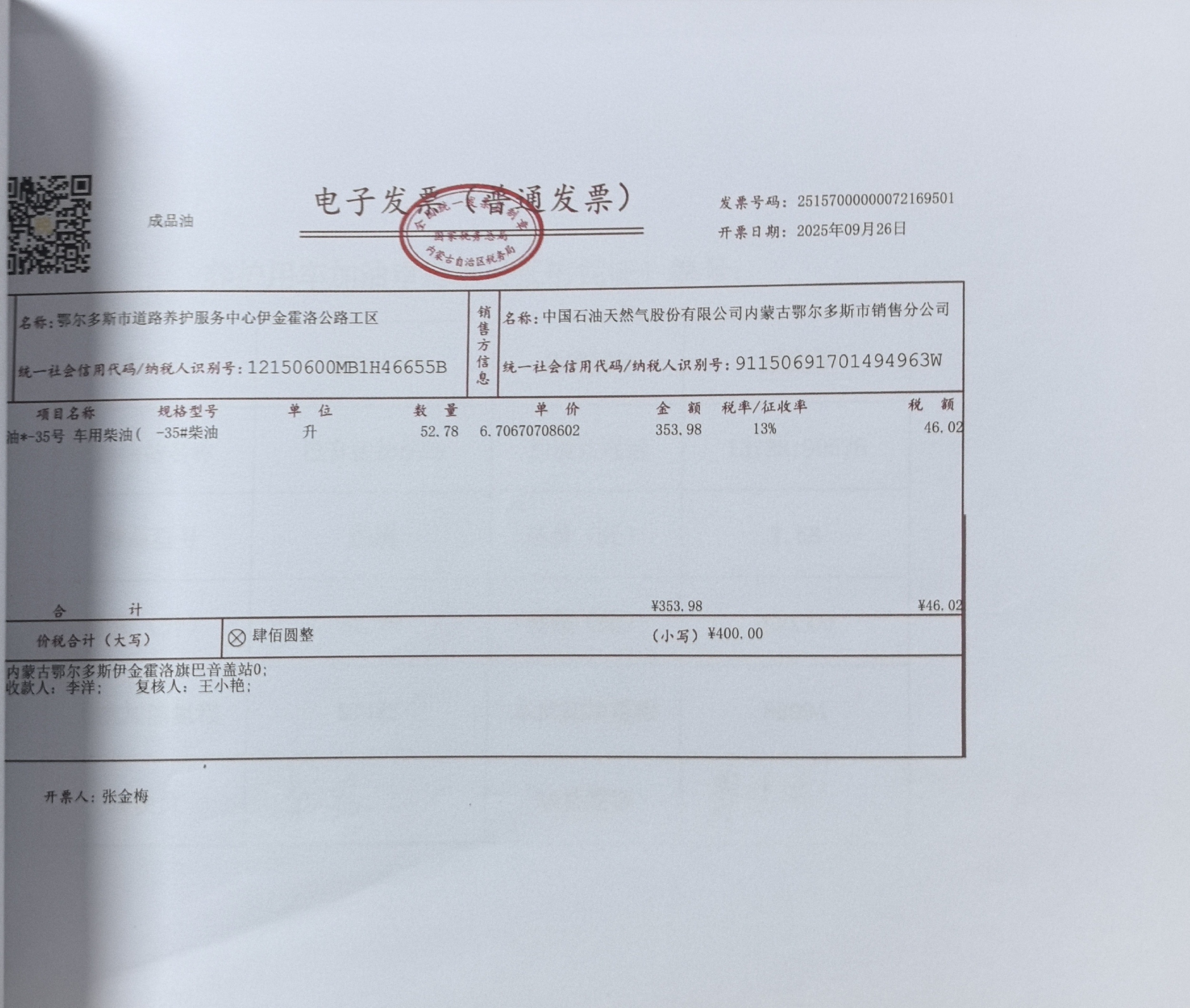 鄂尔多斯市道路养护服务中心伊金霍洛公路工区车辆加油(新街养护站巡查)政...