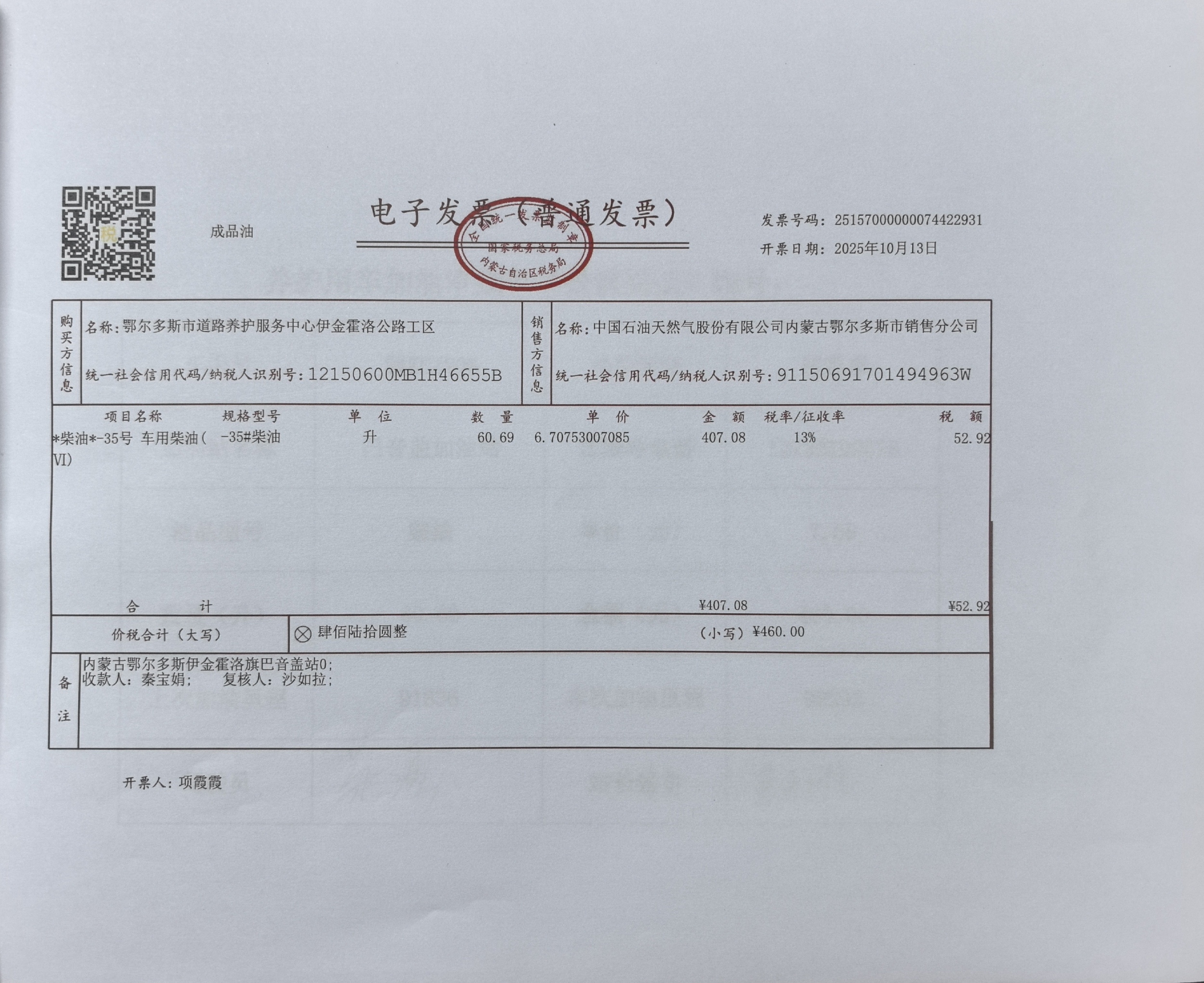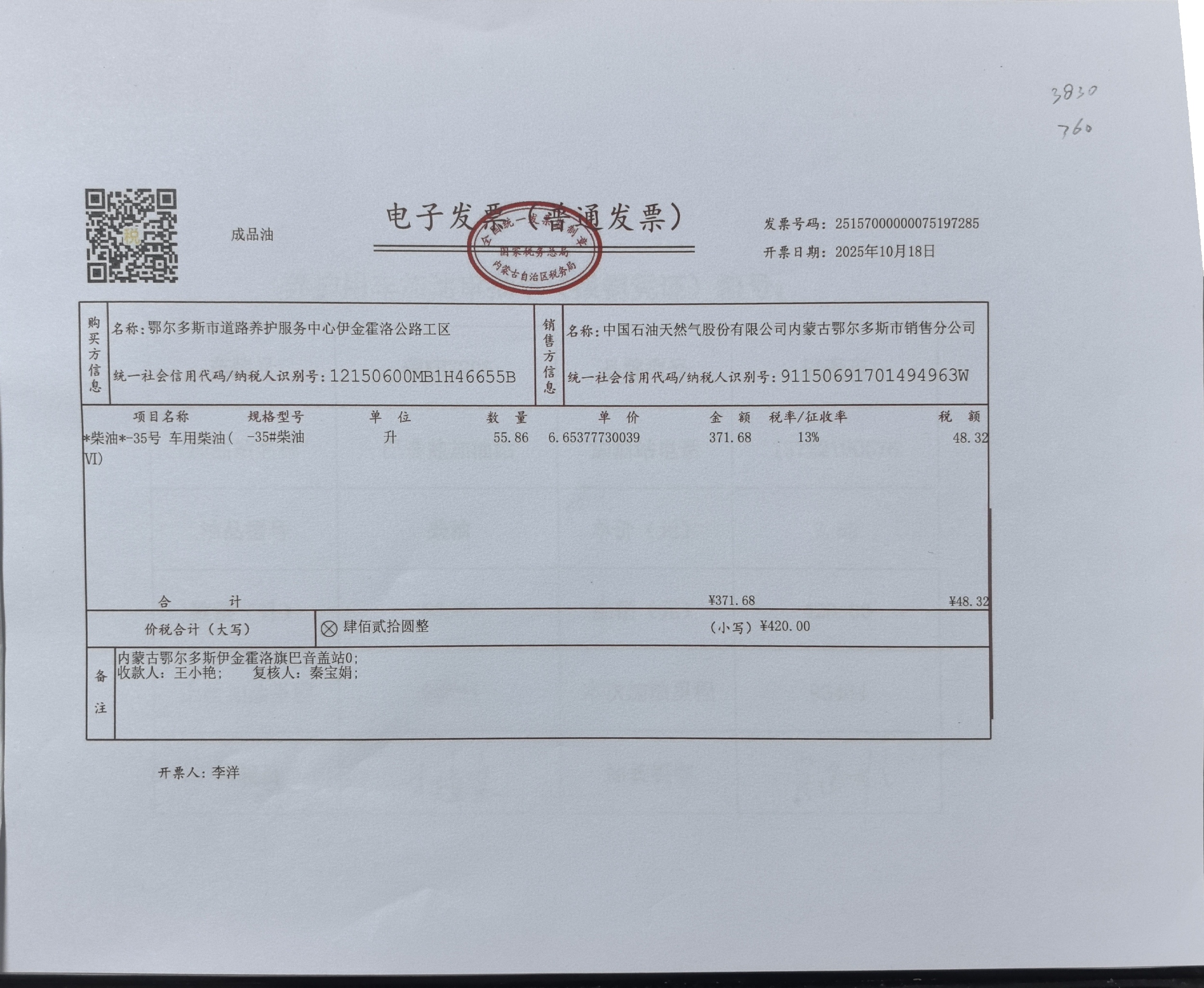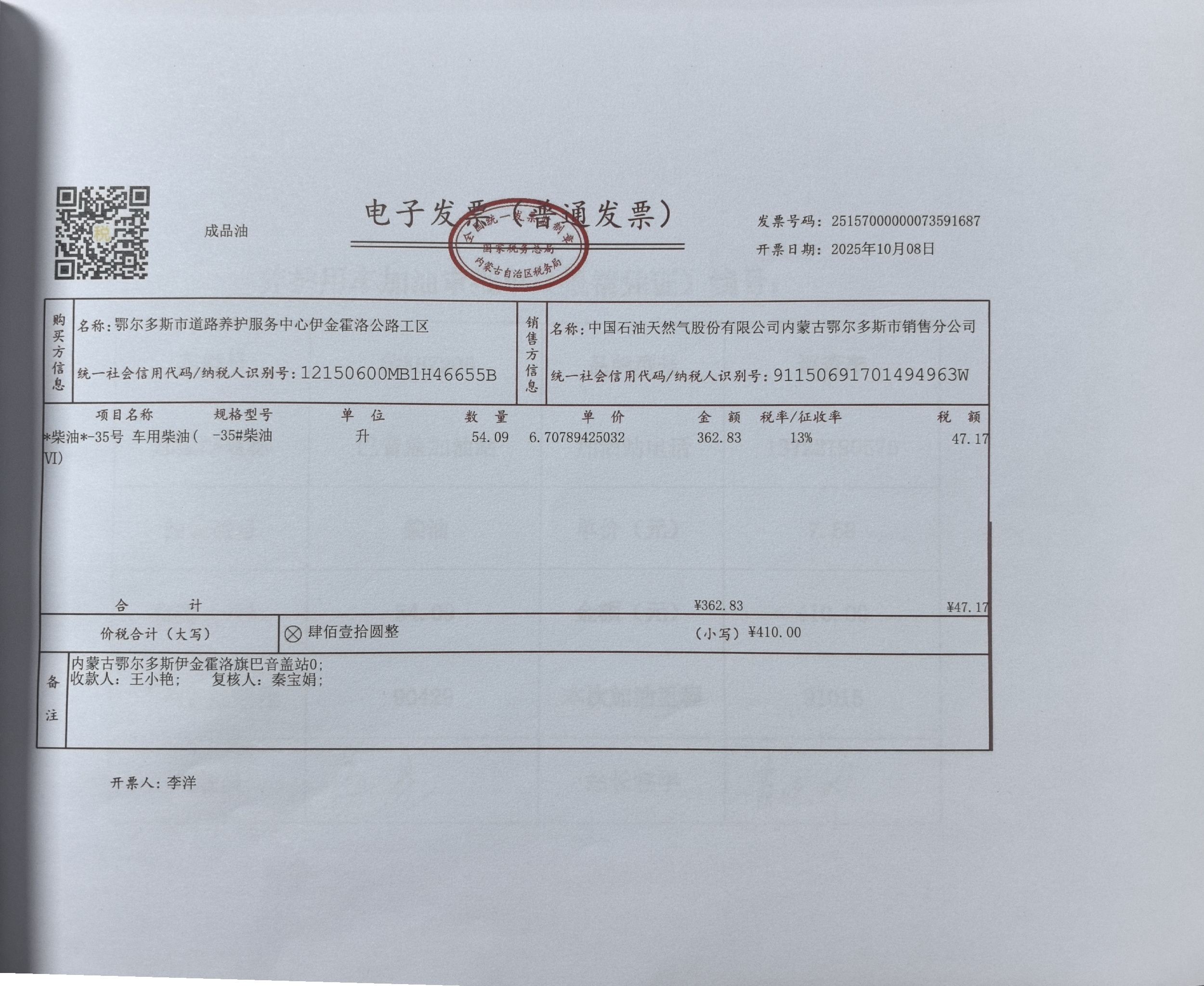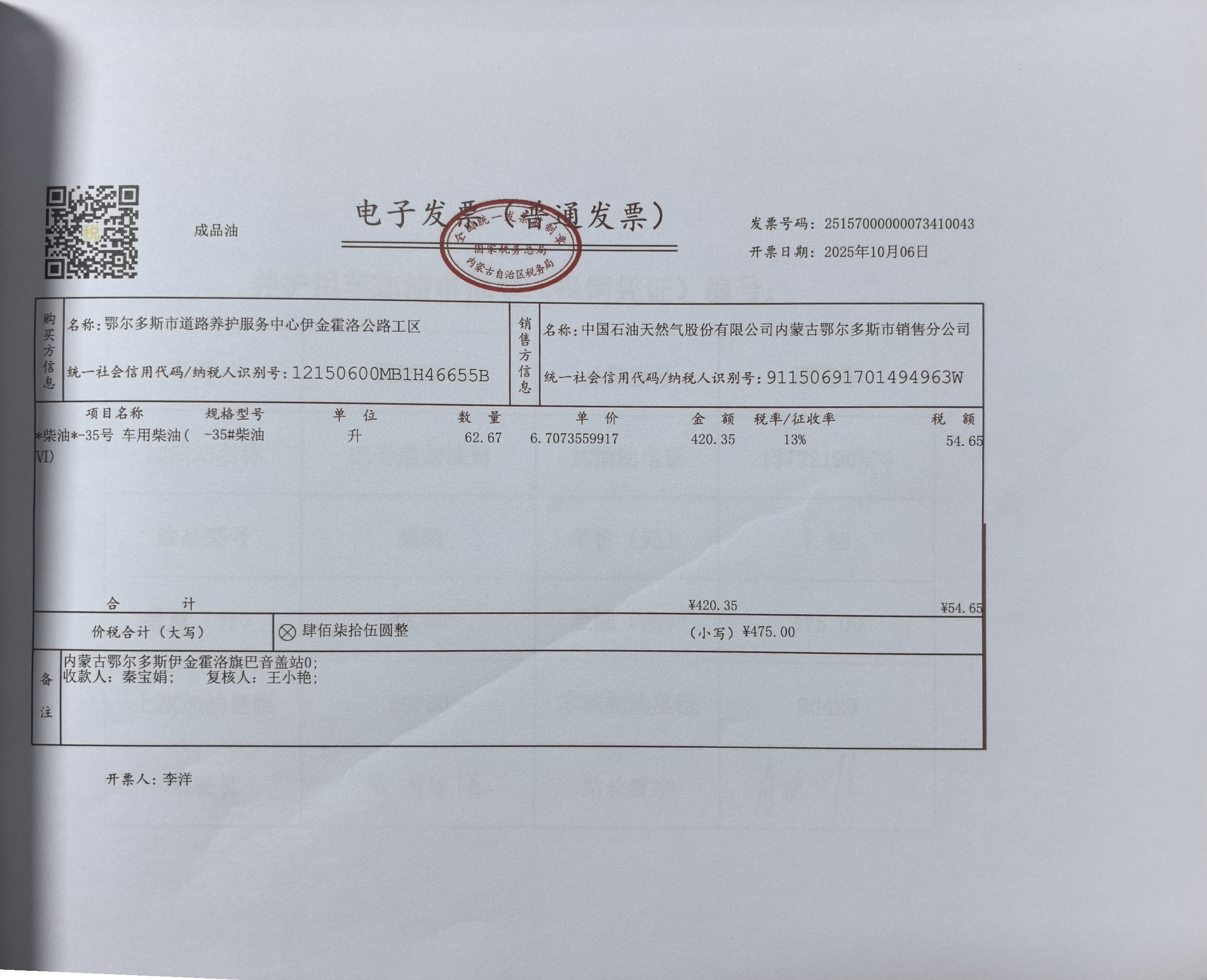 鄂尔多斯市道路养护服务中心伊金霍洛公路工区车辆加油(新街养护站巡查)政...