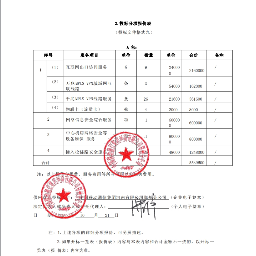 | *.采购内容:采购郑州教育城域网核心机房***互联网出口带宽服务、接入端***** ***链路服务、城域网中心机房网络安全服务及局属学校和二级机构的网络链路安全服务等相关服务(详见招标文件)。 *.质量标准:满足采购需求,符合国家、行业规定的规范标准。 *.服务地点:采购人指定地点。 *.合同履行期限:自合同签订之日起*年。 | |||||||||||||||||||||||||||||||||||||||||||||||||||||||