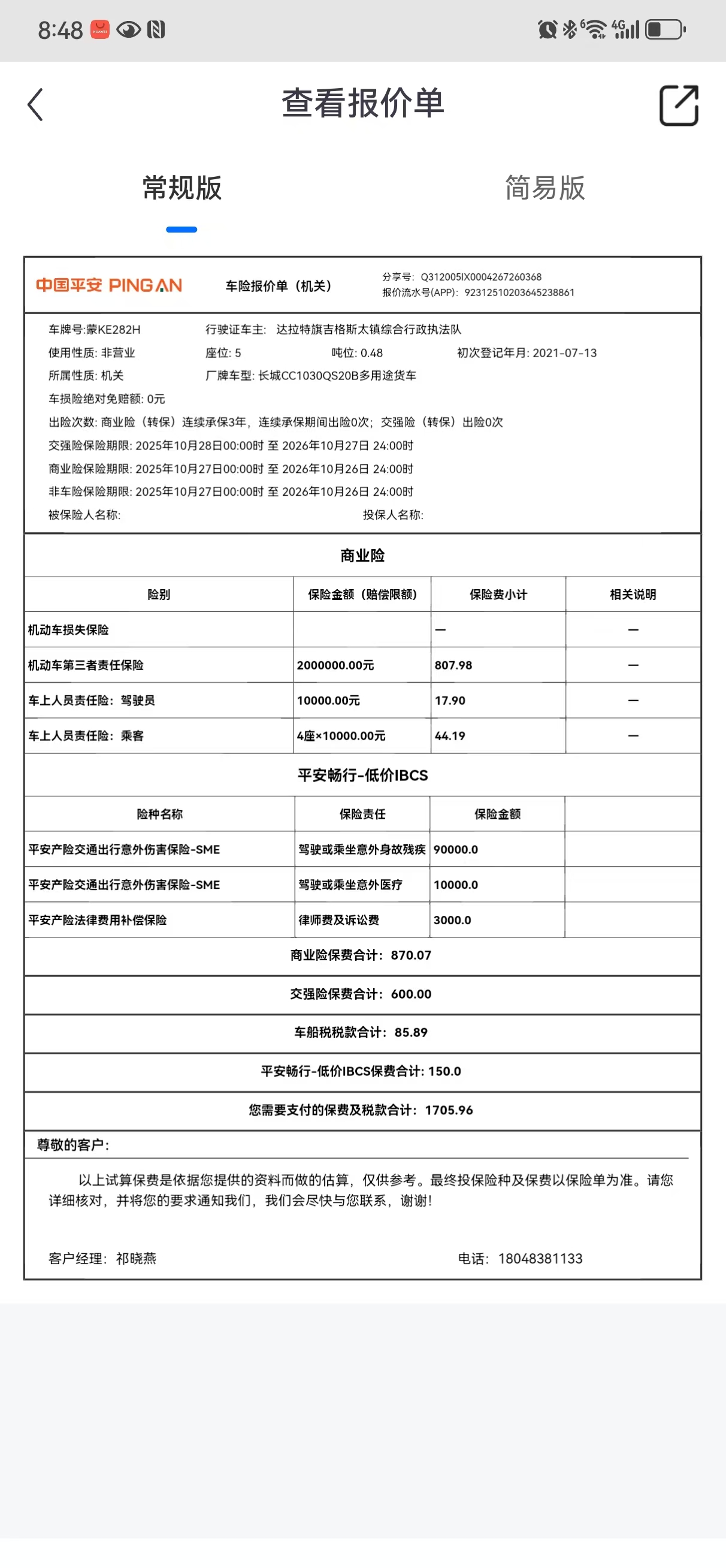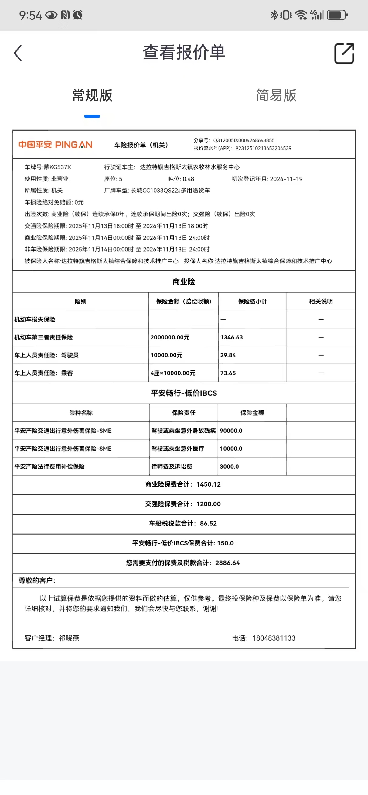 一、合同编号:************二、合同名称:公务用车保险三、项目编号:鄂财购备字(电子)[****]*******号四、项目名称:公务用车保险(蒙******、蒙*****、蒙******、蒙*****)五、合同主体采购人(甲方):吉格斯太镇人民政府 地址:鄂尔多斯市达拉特旗 联系方式:*********** 供应商(乙方):中国平安财产保险股份有限公司鄂尔多斯中心支公司 地址:内蒙古自治区鄂尔多斯市东胜区乌审街北那日松路东九号街南规划路西 联系方式:*********** 六、合同主要信息主要标的: