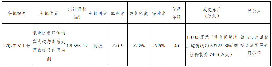 根据《招标拍卖挂牌出让国有建设用地使用权规定》(国土资源部令第**号),现将徽州区国有建设用地使用权挂牌出让成交结果公示如下: