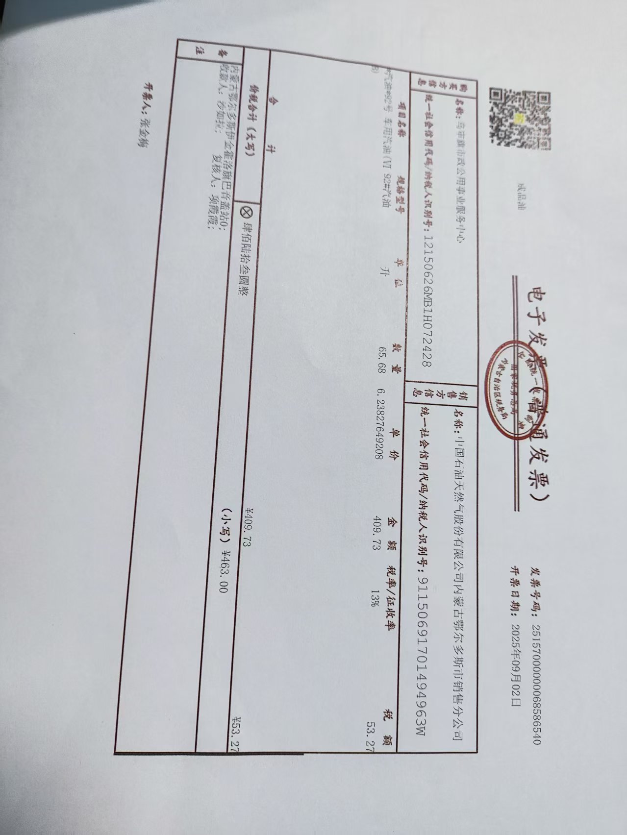 乌审旗市政公用事业服务中心2025年出差加油463(张德)政府采购合同公告
