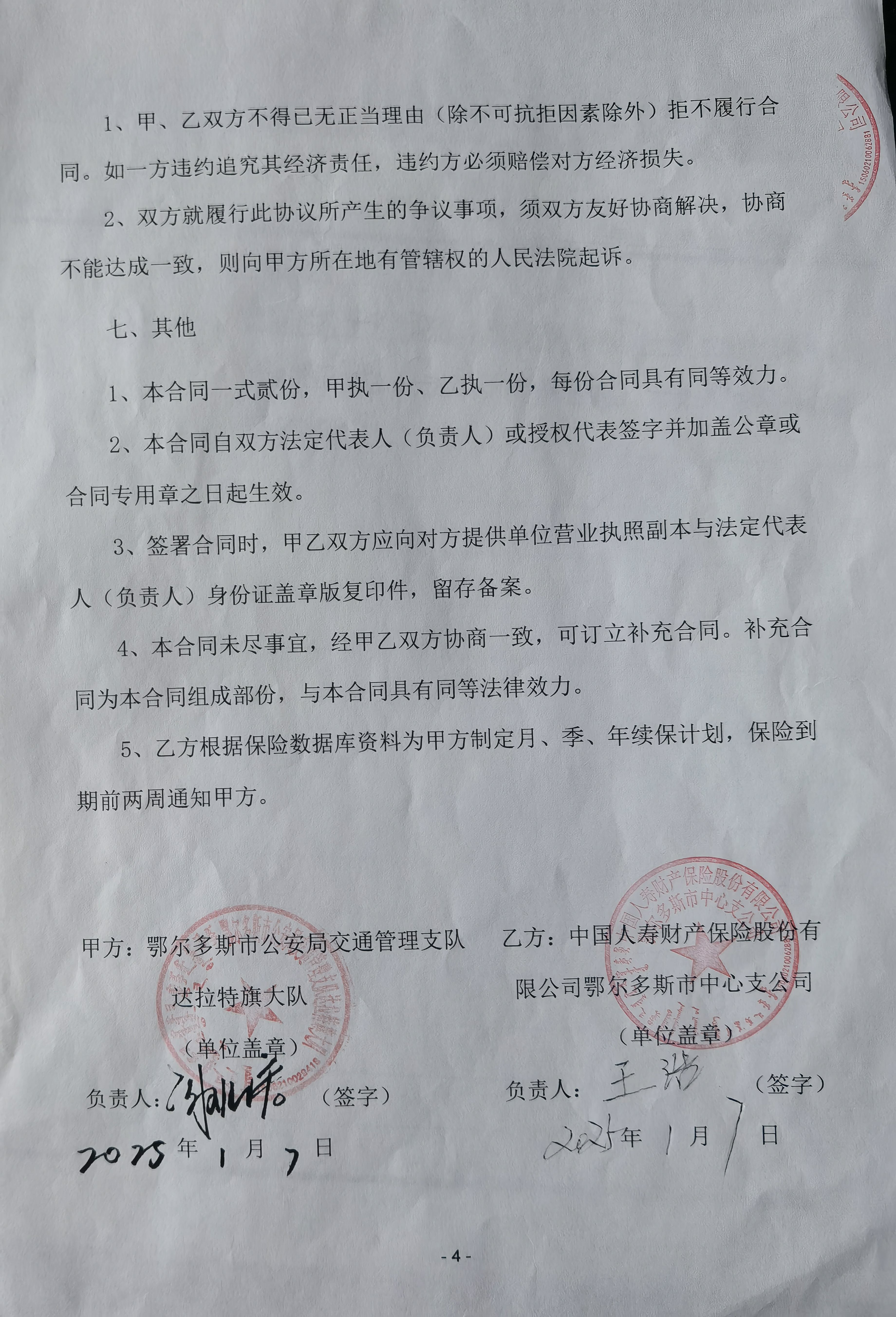 一、合同编号:***********二、合同名称:达旗大队公务用车保险项目合同书三、项目编号:鄂财购备字(电子)[****]*****号四、项目名称:达旗大队公务用车保险项目五、合同主体采购人(甲方):鄂尔多斯市公安局交通管理支队达拉特旗大队 地址:达旗树林召镇 联系方式:*********** 供应商(乙方):中国人寿财产保险股份有限公司鄂尔多斯市中心支公司 地址:内蒙古自治区鄂尔多斯市东胜区内蒙古自治区鄂尔多斯市东胜区天骄街道鄂托克西街北迎宾路东鑫隆综合商务楼**楼西北侧 **楼整层 联系方式:*********** 六、合同主要信息主要标的: