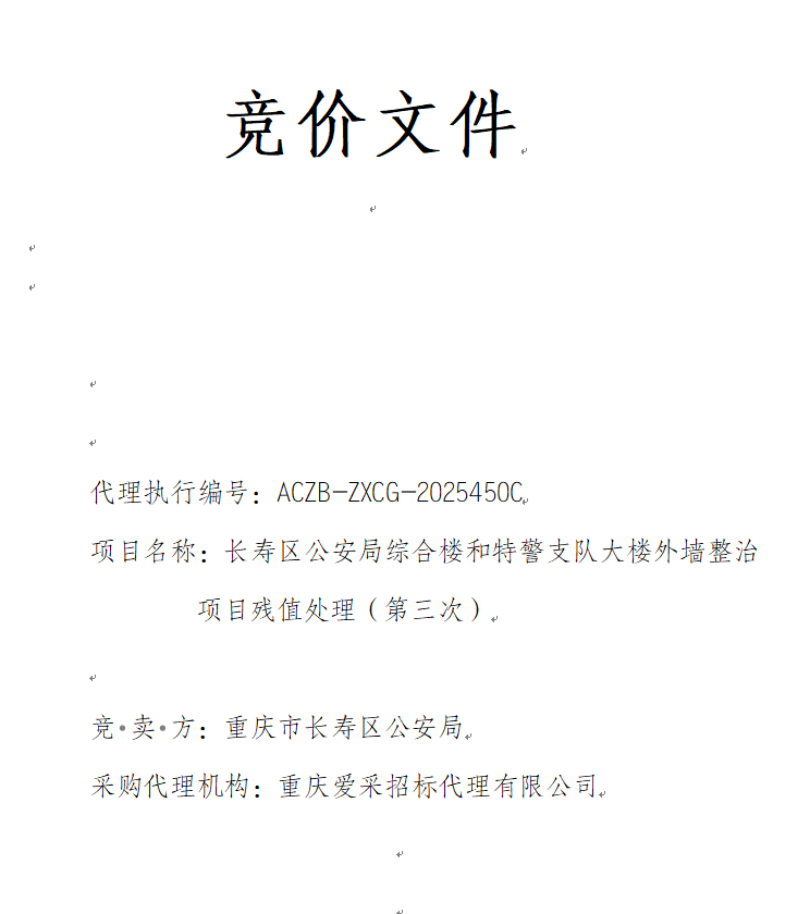 重庆爱采招标代理有限公司(租售方)对长寿区公安局综合楼和特警支队大楼外墙整治项目残值处理(第三次)(项目)采用一次性报价模式发起了公开处置,欢迎符合项目要求竞买方参与一次性报价