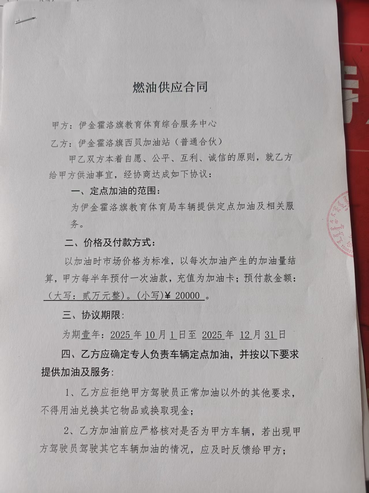 一、合同编号:鄂财购备字(电子)[****]*******号二、合同名称:采购车辆燃料加注服务三、项目编号:鄂财购备字(电子)[****]*******号四、项目名称:采购车辆燃料加注服务五、合同主体采购人(甲方):伊金霍洛旗教育体育综合服务中心 地址:鄂尔多斯市伊金霍洛旗 联系方式:*********** 供应商(乙方):伊金霍洛旗西贝加油站(普通合伙) 地址:内蒙古自治区鄂尔多斯市伊金霍洛旗内蒙古自治区鄂尔多斯市伊金霍洛旗阿镇维一路南、公园街西、公园街辅一路东 联系方式:*********** 六、合同主要信息主要标的: