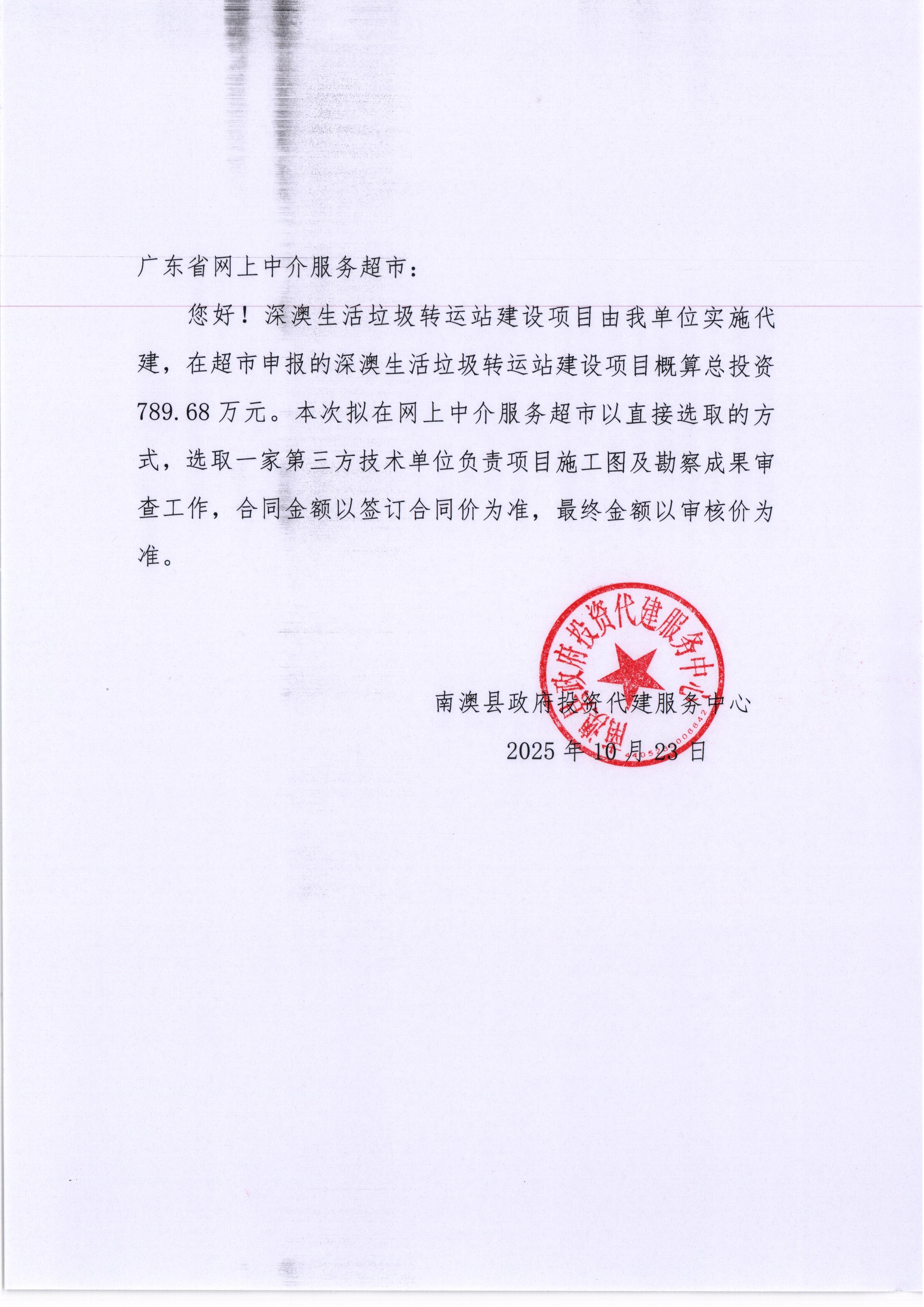 关于为【深澳生活垃圾转运站建设项目 施工图及勘察成果审查】公开选取【房屋建筑和市政基础设施工程施工图设计文件审查】机构的公告