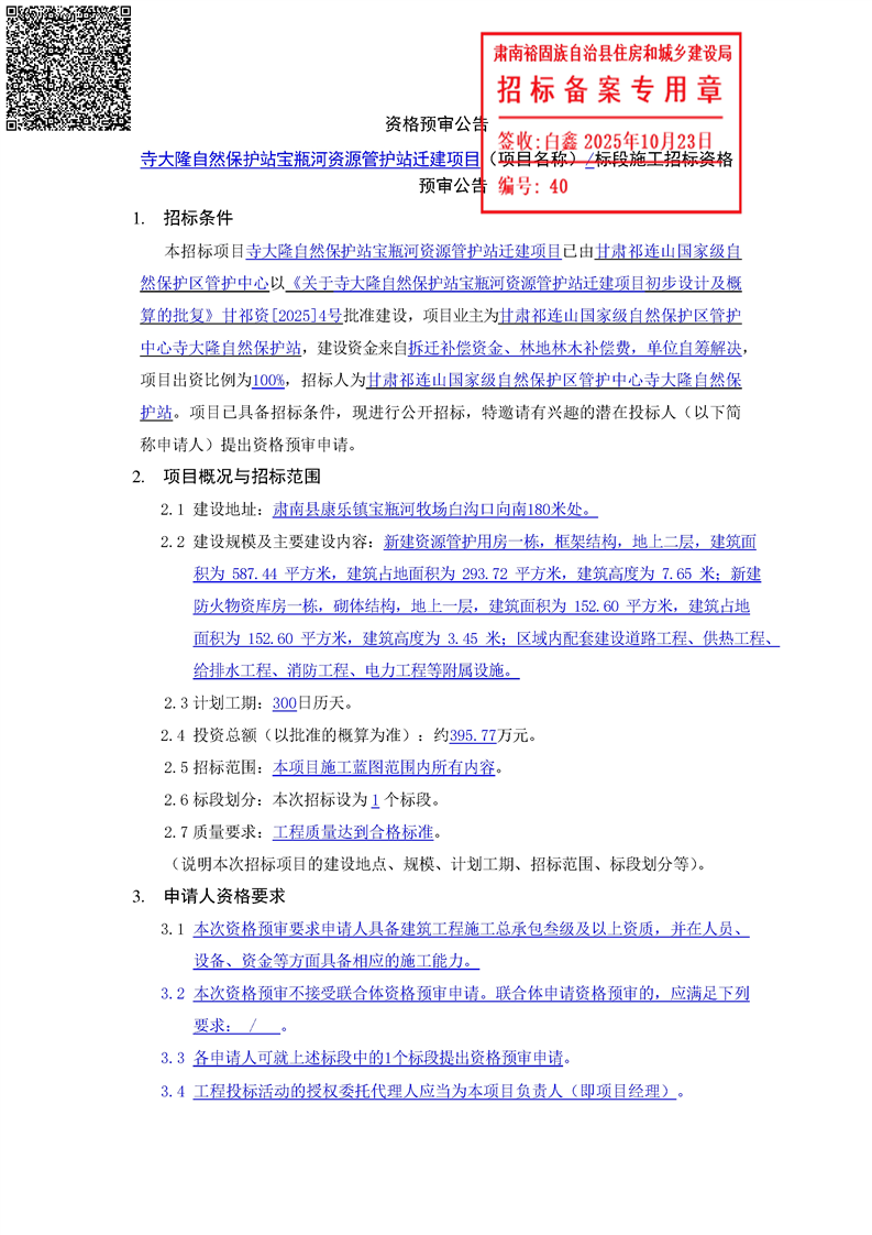寺大隆自然保护站宝瓶河资源管护站迁建项目招标/资审公告