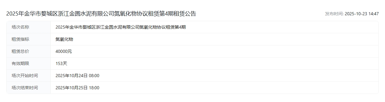 华市婺城区浙江金圆水泥有限公司氮氧化物协议租赁第4期租赁公告