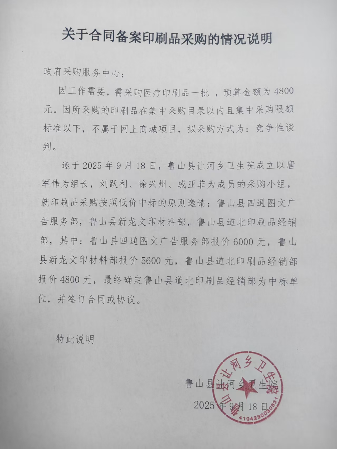 | 二、合同名称:鲁山县让河乡卫生院让河卫生院采购印刷品项目 | ||||||||||||