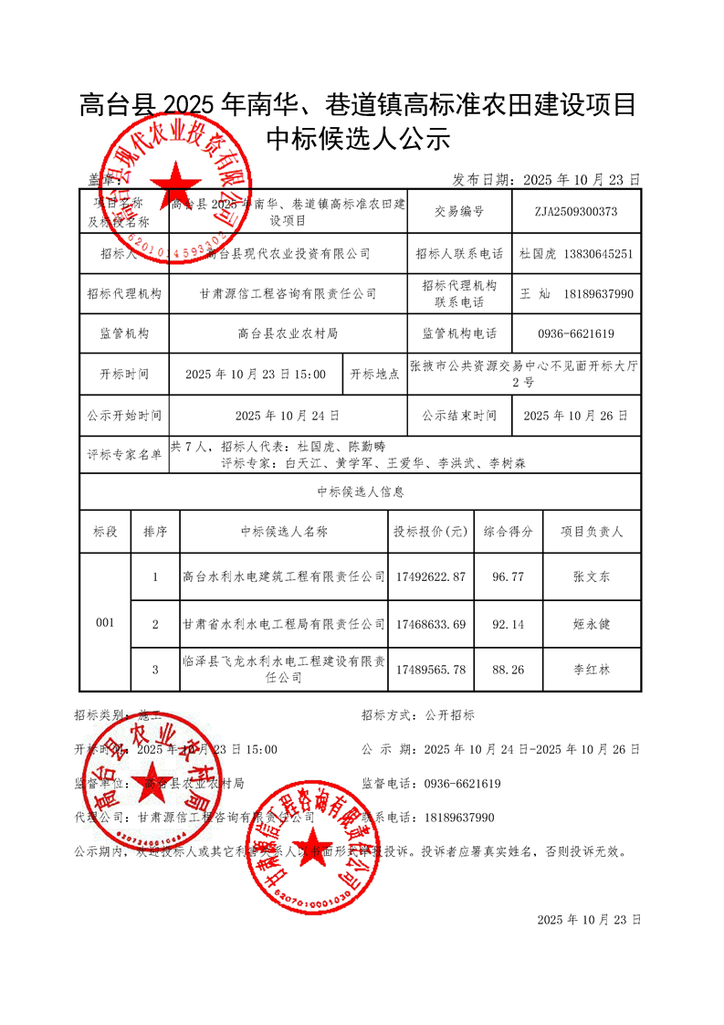 [市本级]高台县2025年南华、巷道镇高标准农田建设项目中标候选人公示