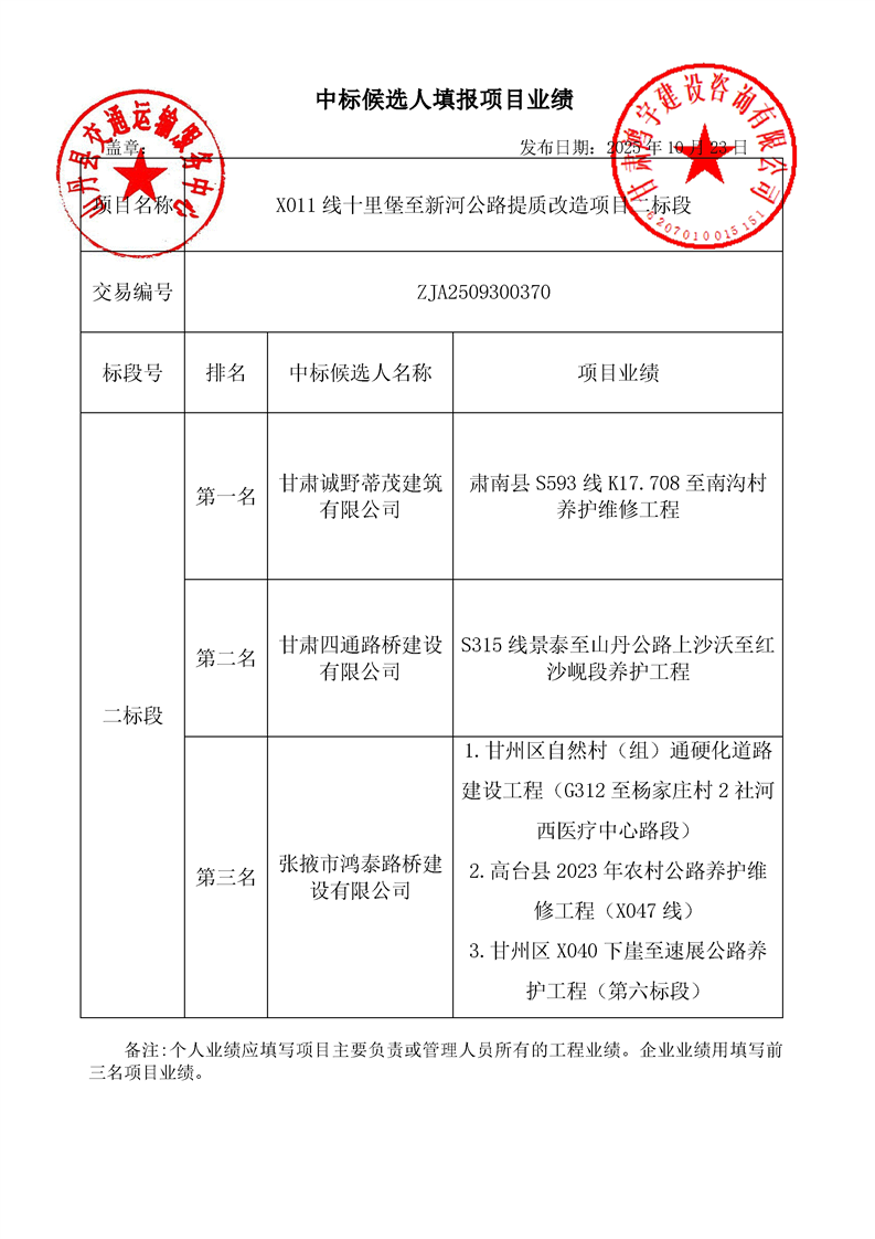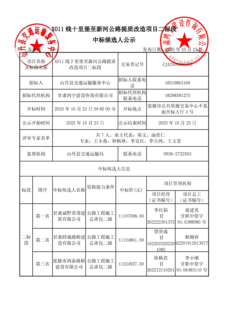 [市本级]X011线十里堡至新河公路提质改造项目二标段中标候选人公示