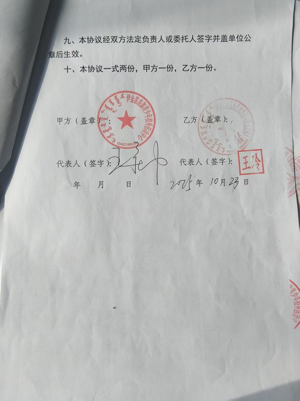 合同金额: **,***.**元,大写(人民币):壹万元整 履约期限:****年**月**日至****年**月**日 履约地点:伊金霍洛旗青少年校外活动中心 采购方式: 七、合同签订日期****年**月**日 八、合同公告日期****年**月**日 九、其他补充事宜