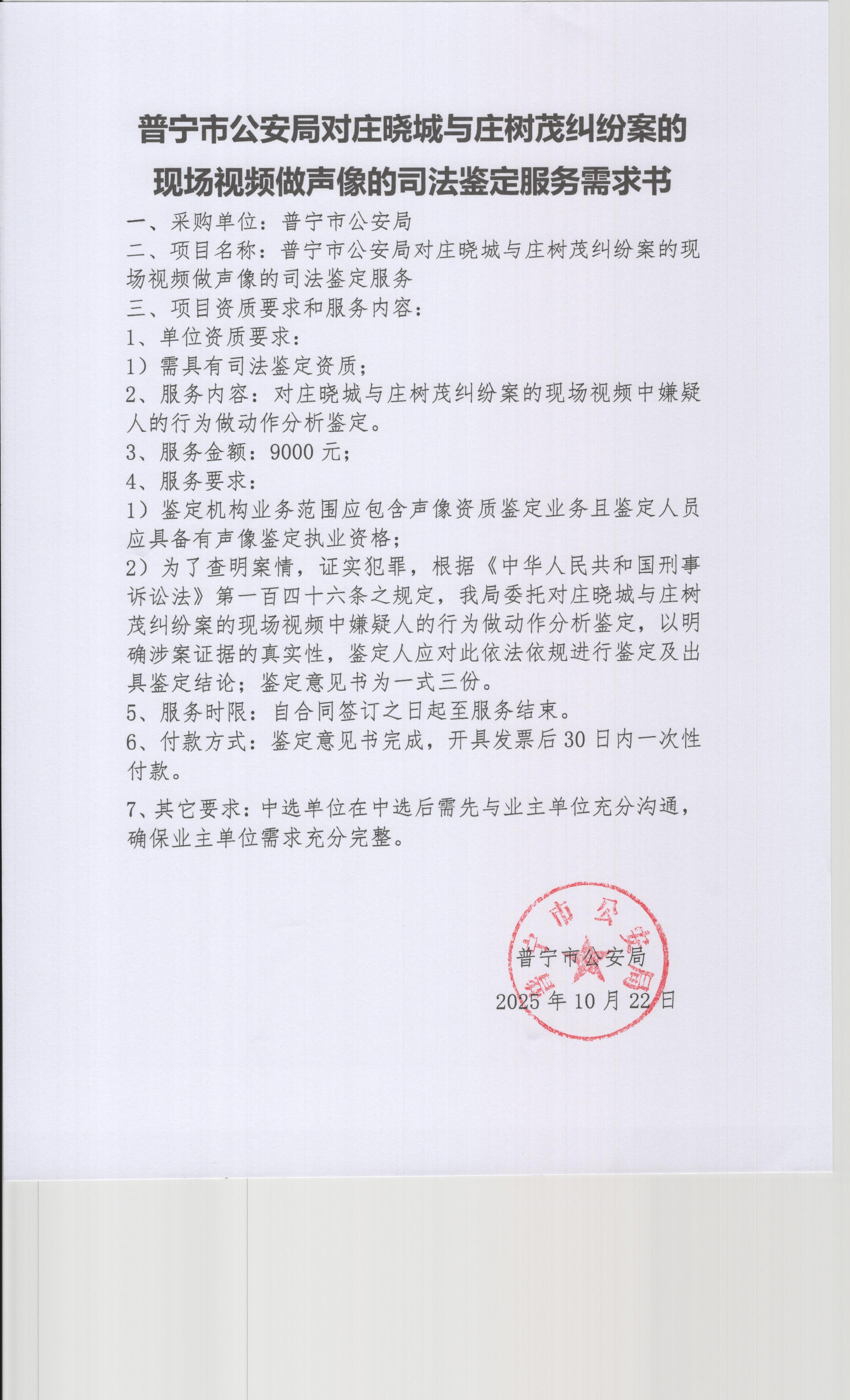 普宁市公安局对庄晓城与庄树茂纠纷案的现场视频做声像的司法鉴定服务采购公告