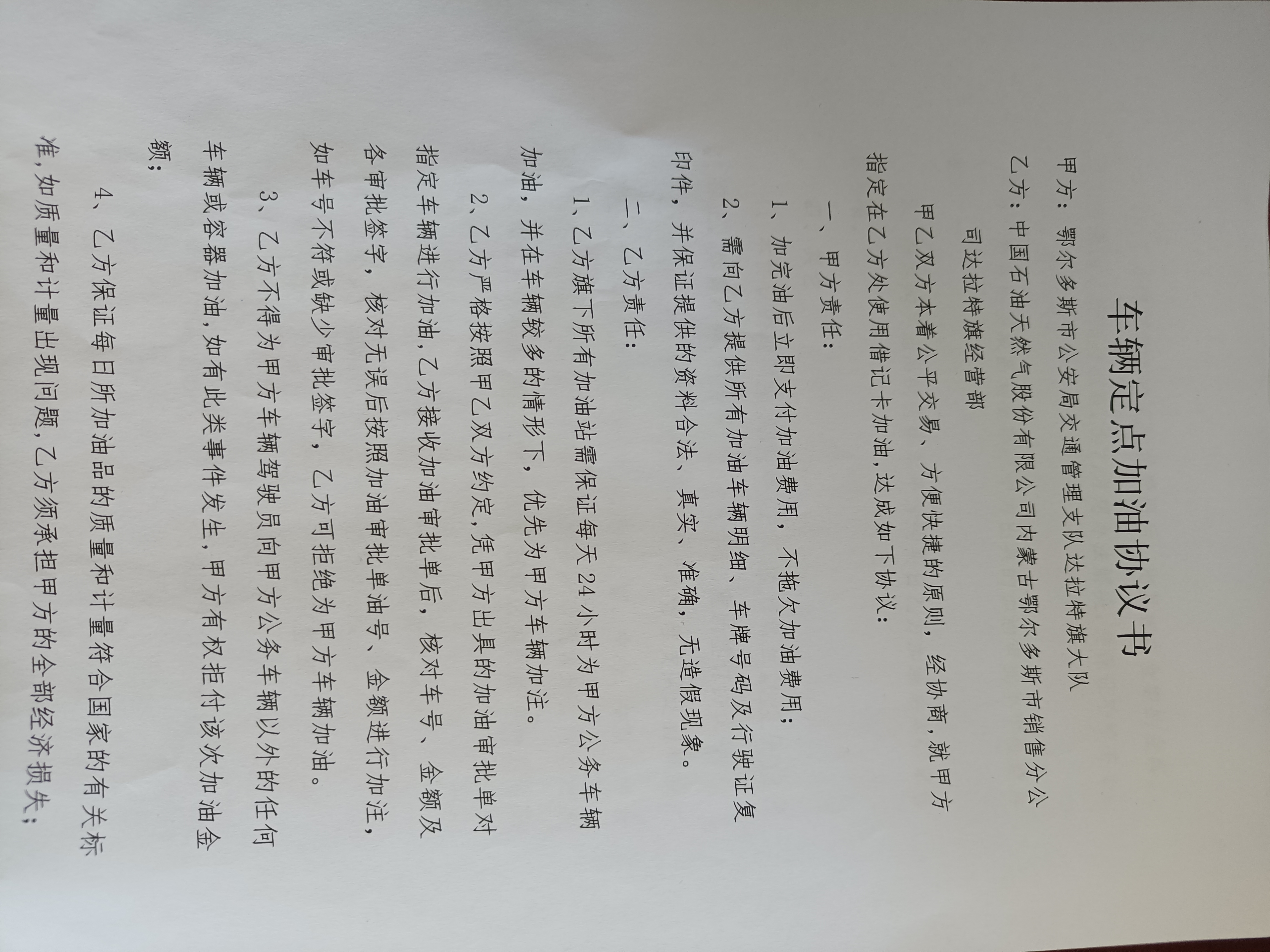 一、合同编号:***********二、合同名称:耳字壕中队中石油加油站加油项目合同书三、项目编号:鄂财购备字(电子)[****]*****号四、项目名称:耳字壕中队公务用车加油项目五、合同主体采购人(甲方):鄂尔多斯市公安局交通管理支队达拉特旗大队 地址:达旗树林召镇 联系方式:*********** 供应商(乙方):中国石油天然气股份有限公司内蒙古鄂尔多斯市销售分公司 地址:内蒙古自治区鄂尔多斯市康巴什区正阳街与康盛路交汇处 联系方式:*********** 六、合同主要信息主要标的: