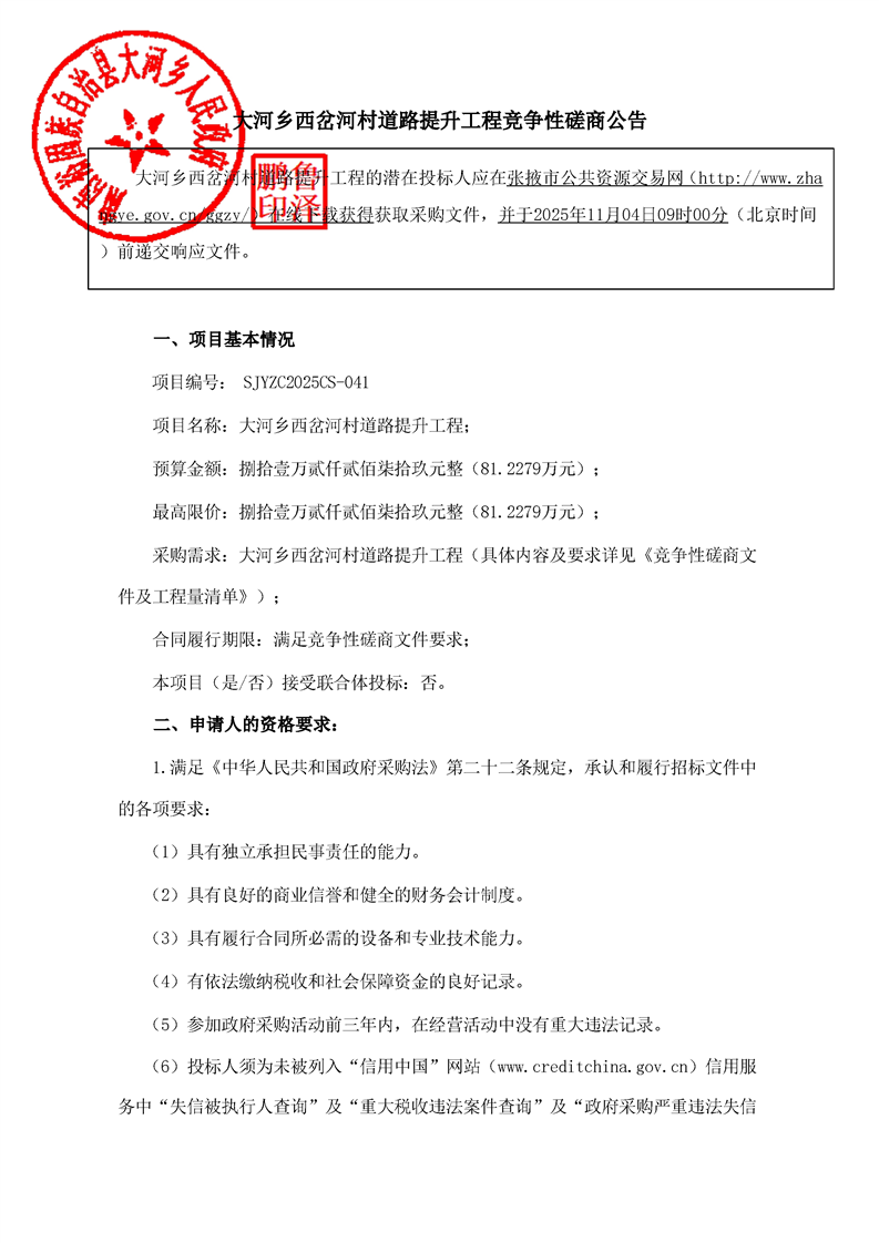 大河乡西岔河村道路提升工程竞争性磋商公告采购/资审公告