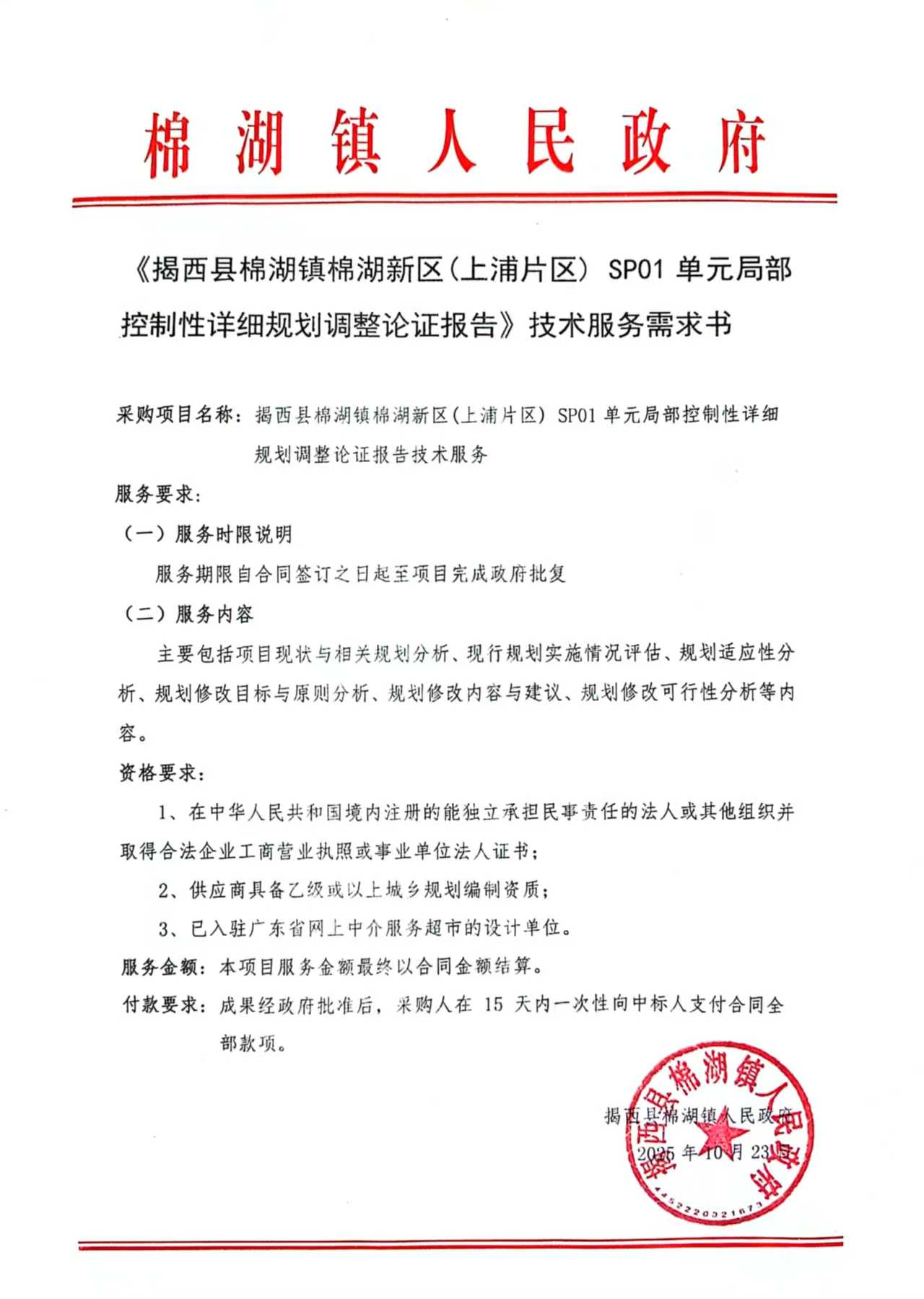 揭西县棉湖镇棉湖新区(上浦片区)SP01单元局部控制性详细规划调整论证报告技术服务采购公告