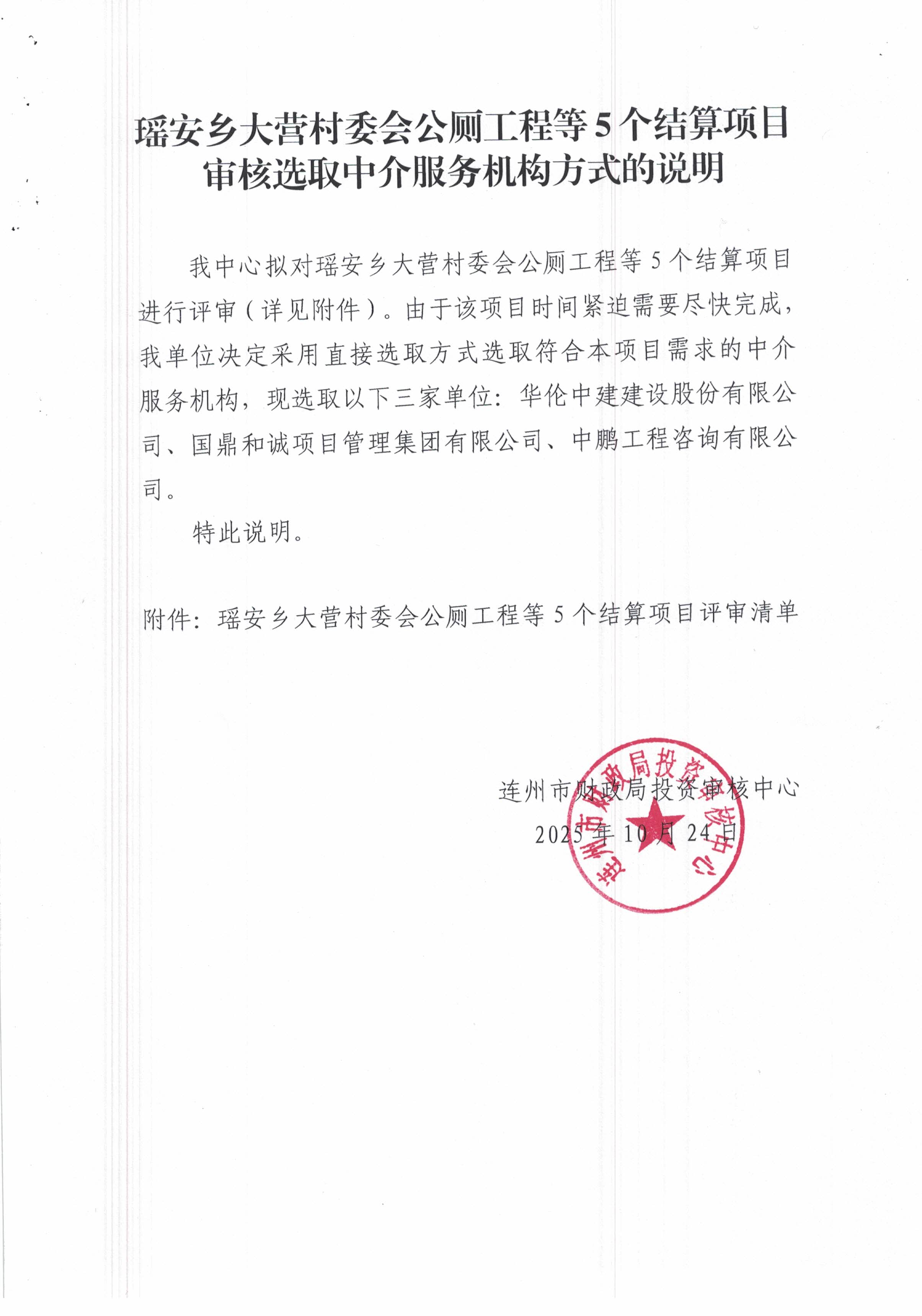 瑶安乡大营村委会公厕工程等5个结算项目评审采购公告