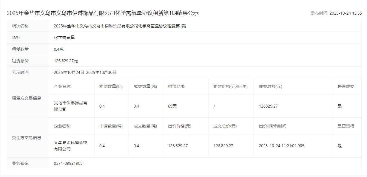 华市义乌市义乌市伊琳饰品有限公司化学需氧量协议租赁第1期结果公示