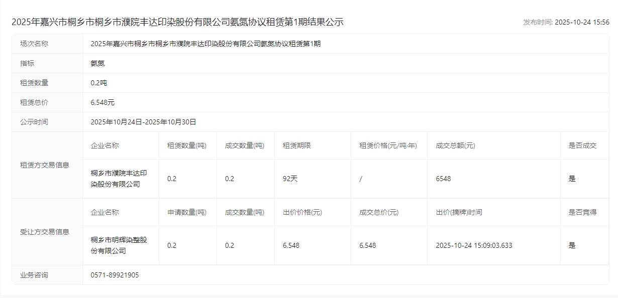 丰达印染股份有限公司氨氮协议租赁第1期结果公示
