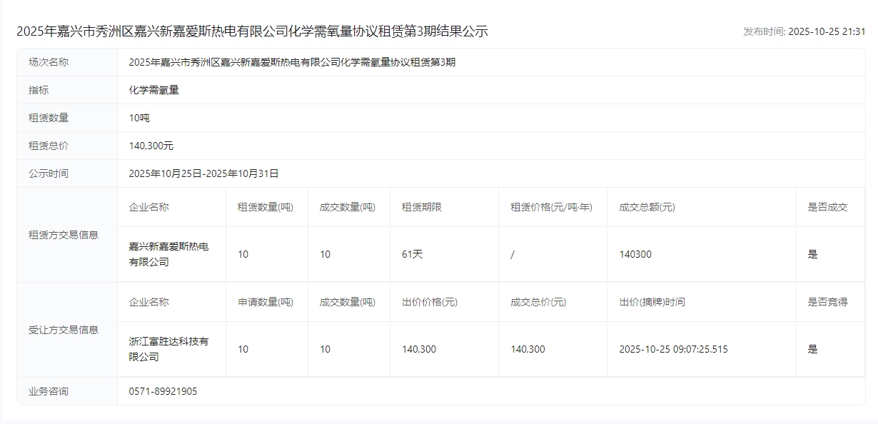热电有限公司化学需氧量协议租赁第3期结果公示