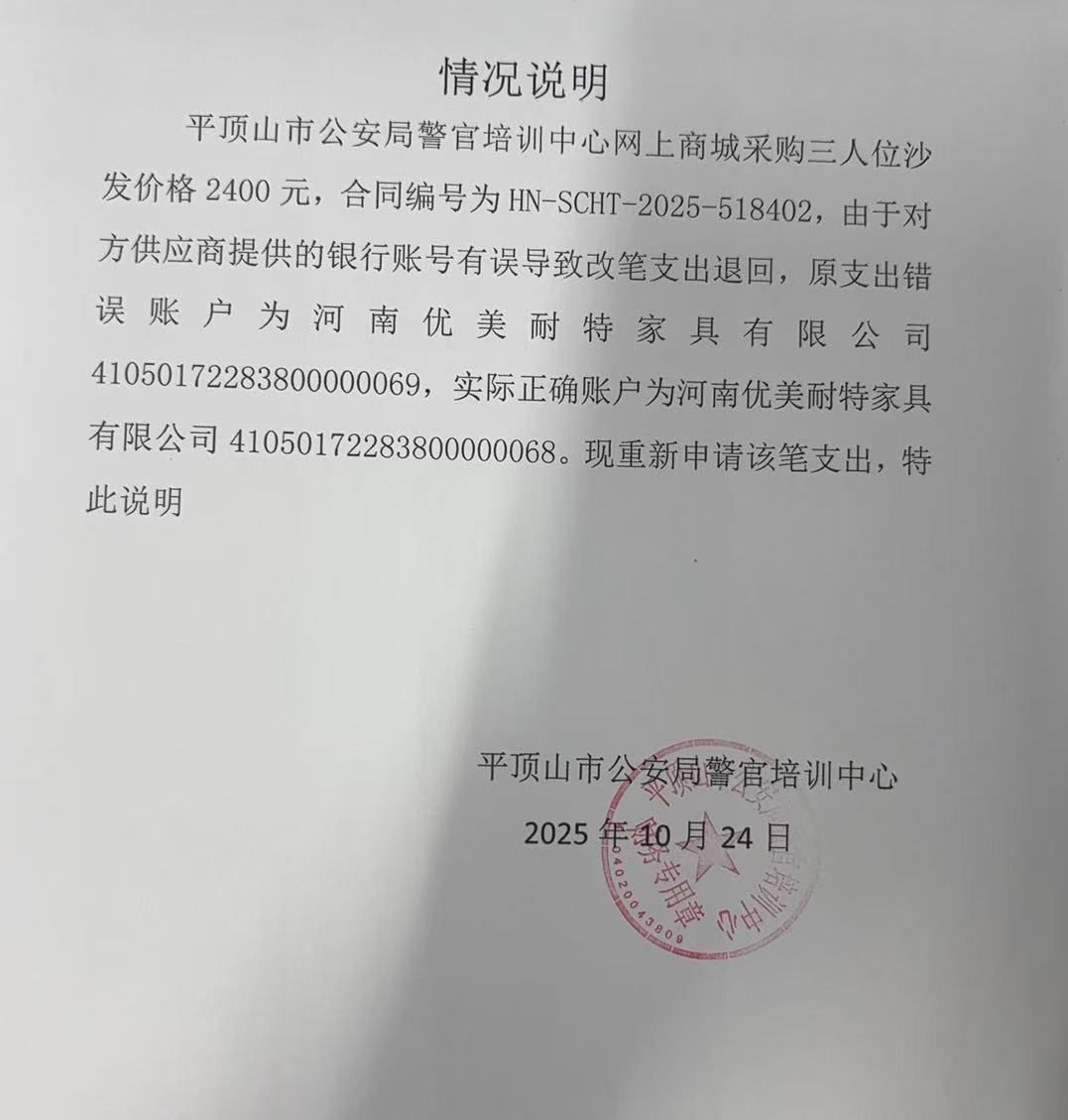 | 平顶山市公安局警官培训中心网上商城采购三人位沙发价格****元,合同编号为*******************,由于对方供应商提供的银行账号有误导致改笔支出退回,原支出错误账户为河南优美耐特家具有限公司********************,实际正确账户为河南优美耐特家具有限公司********************。现重新申请该笔支出 |