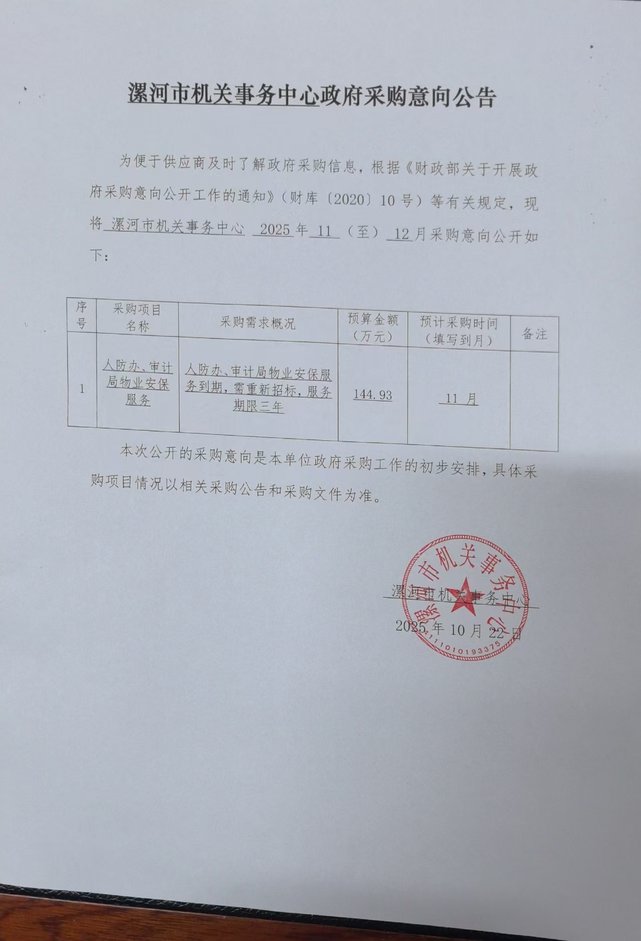 为便于供应商及时了解政府采购信息,根据《河南省财政厅关于开展政府采购意向公开工作的通知》(豫财购〔****〕*号)等有关规定,现将漯河市机关事务中心人防办、审计局物业安保服务 ****年**(至)**月采购意向公开如下: |