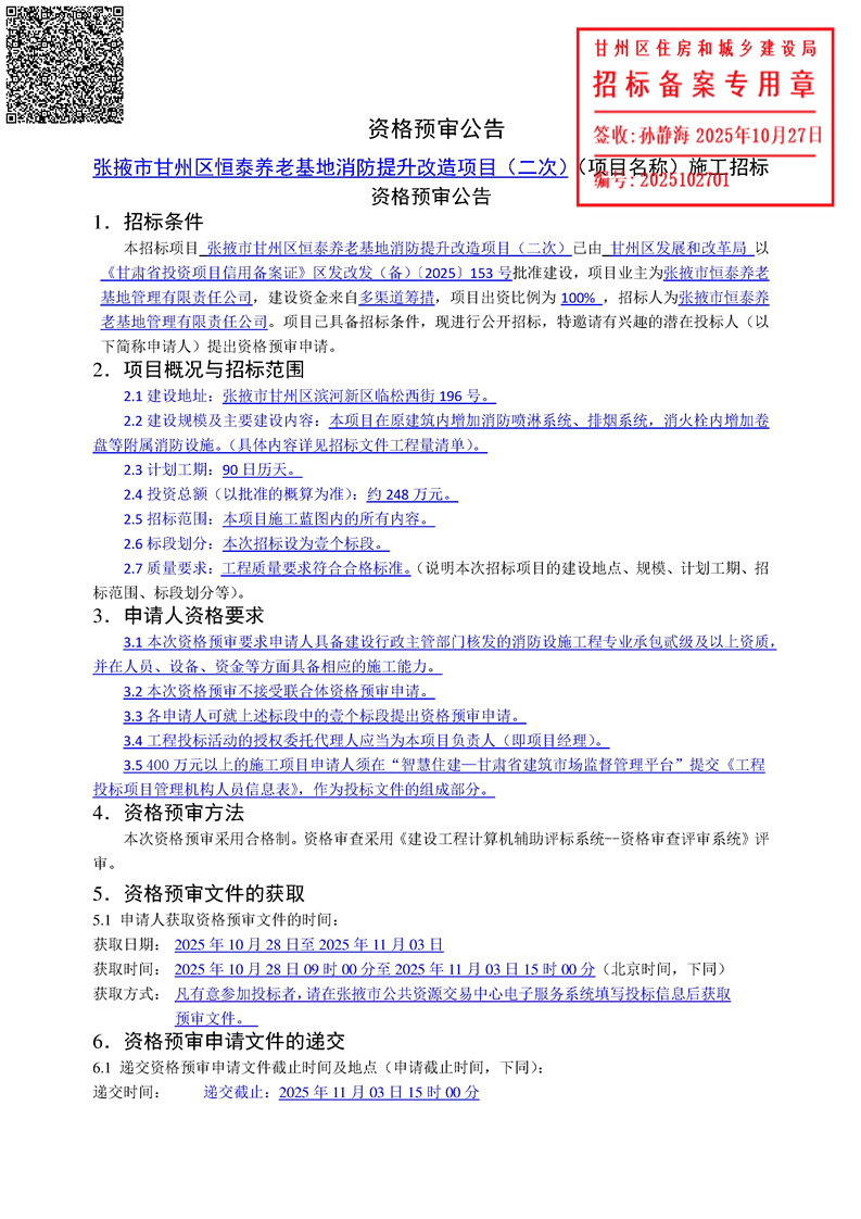 张掖市甘州区恒泰养老基地消防提升改造项目(二次)
